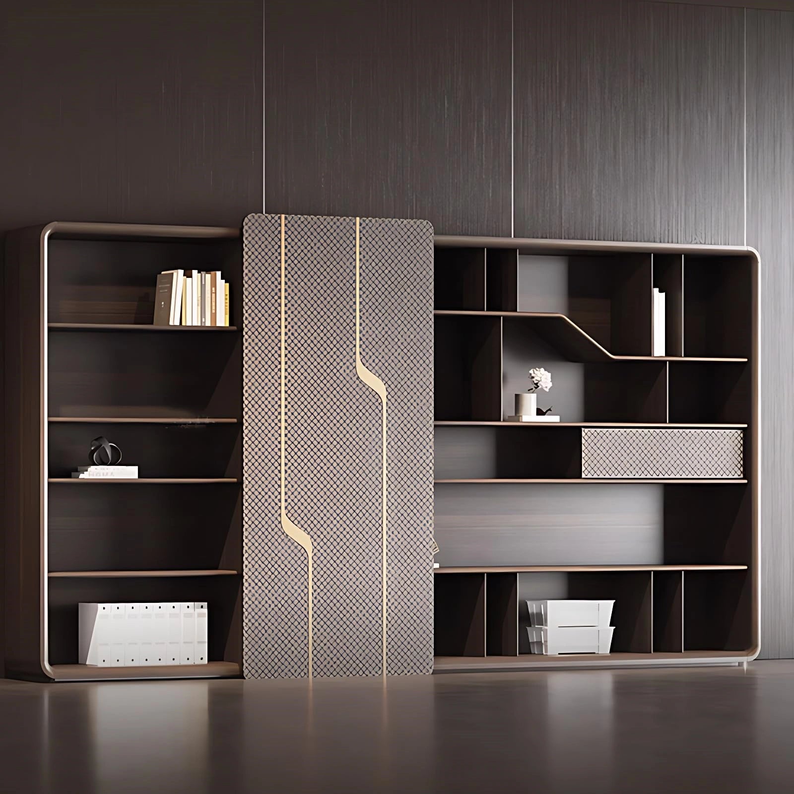 Modern and Elegant: This sophisticated workstation showcases rich espresso woodgrain surfaces contrasted with gray wave-patterned accents, creating dynamic visual texture within its space-efficient L-configuration. The harmonious...