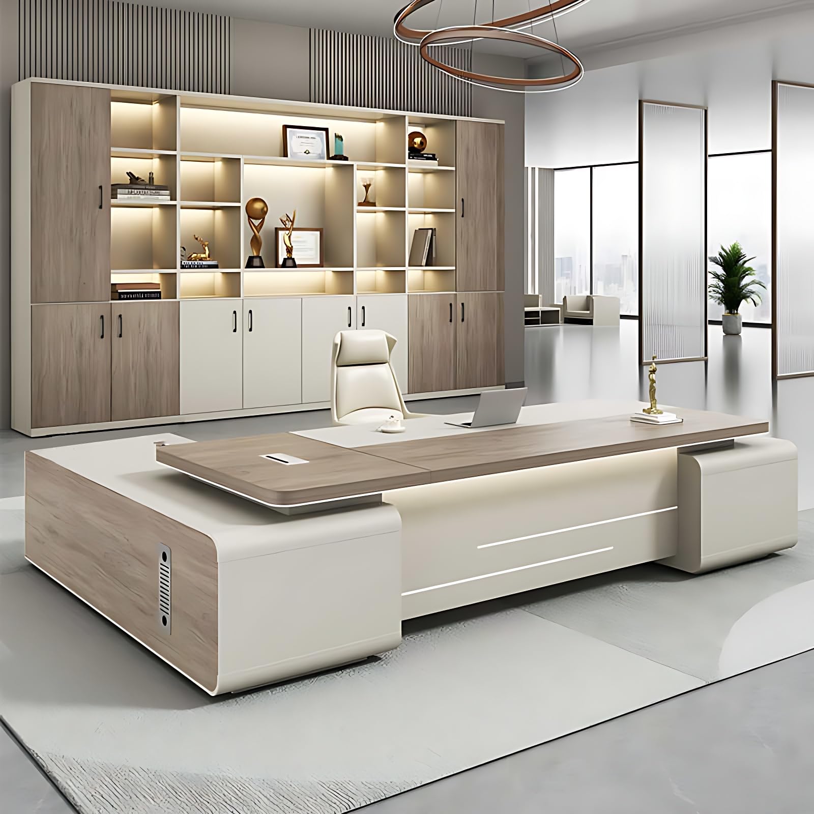 Elegant Executive Desk with Ambient Lighting: This sophisticated workstation features a streamlined LED light strip along its contoured edges, complementing the warm khaki desktop surface. The...