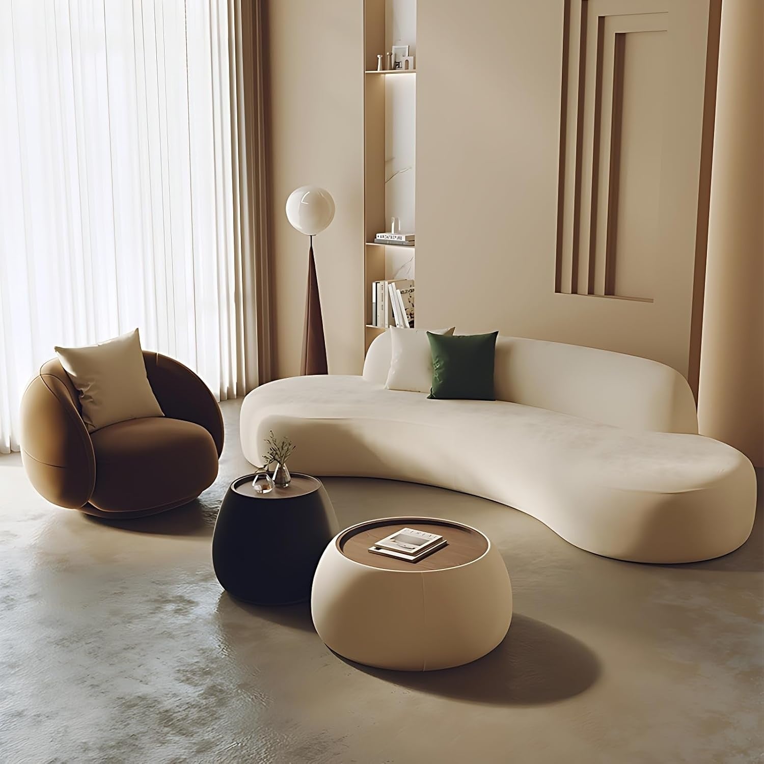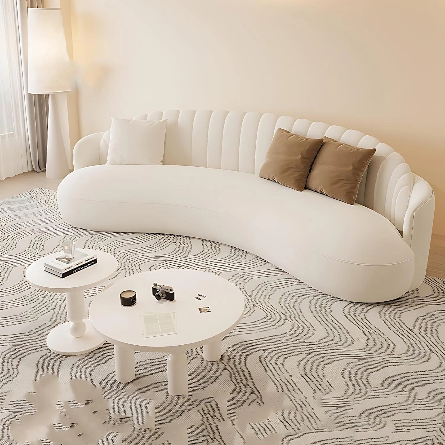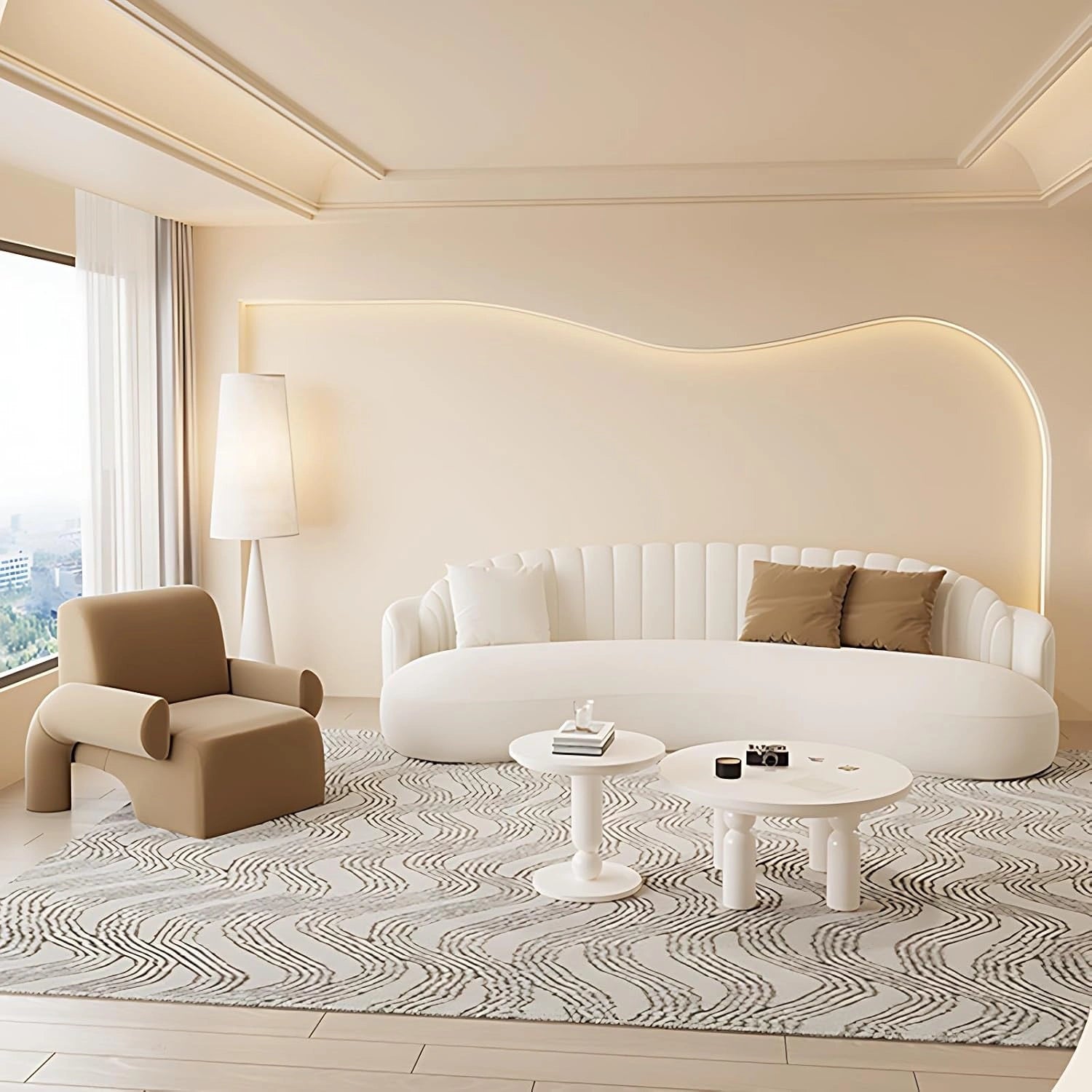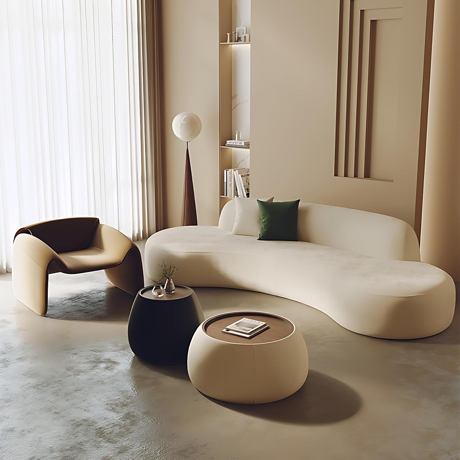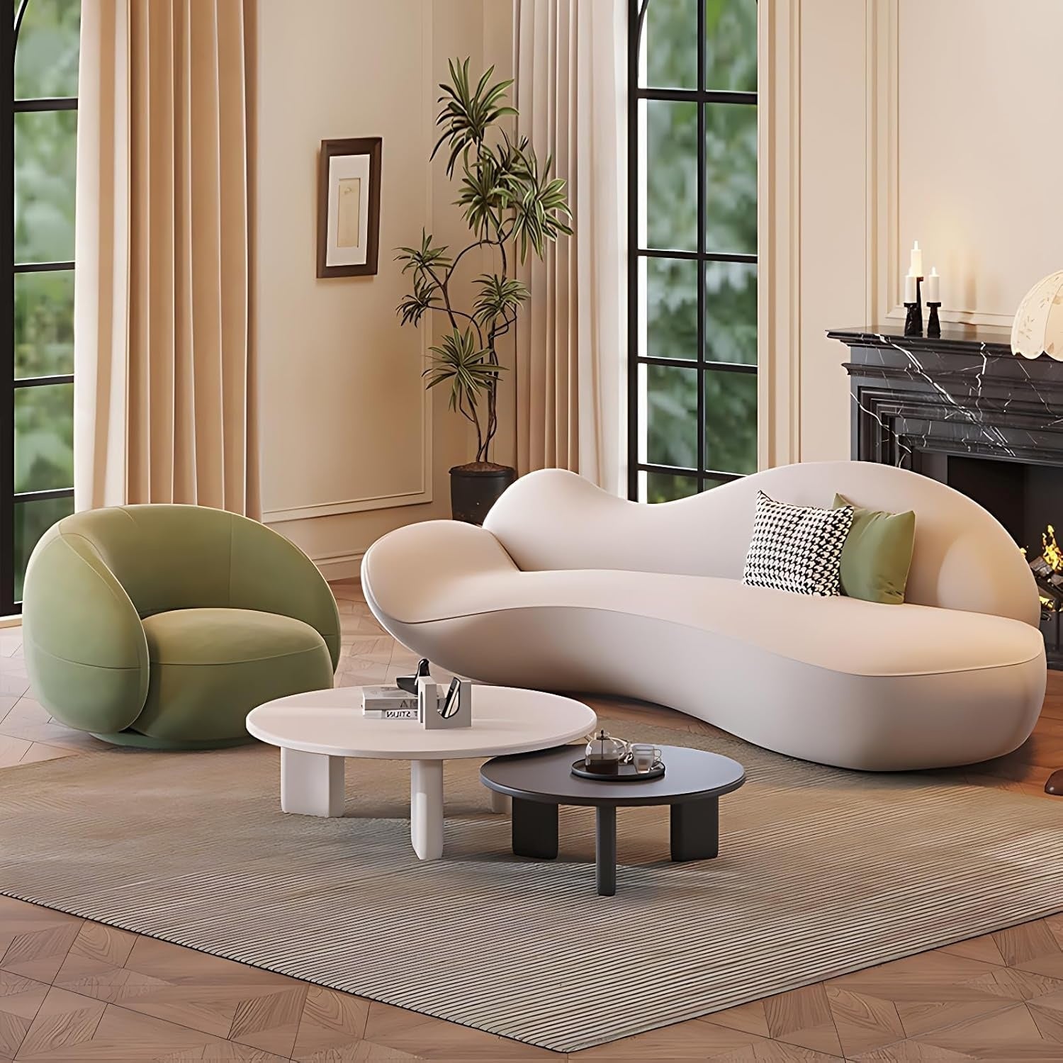 MODERN CREATIVE CURVED DESIGN FOR ELEGANT SPACES - This sectional sofa set features a modern, minimalist curved design that includes a coffee table and single-seat armchairs...