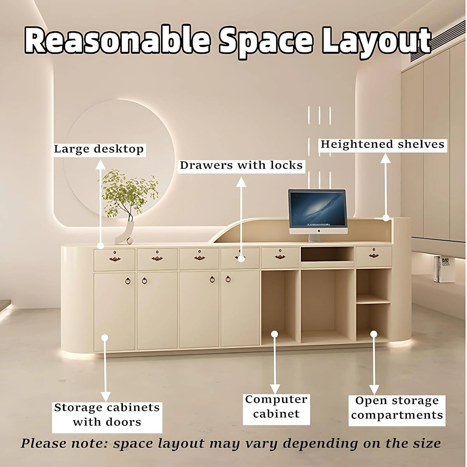 Versatile Design for Multiple Use Scenarios – Whether used as a front desk, a modern reception desk, or a retail counter, its adaptable design fits seamlessly into salons, clinics, and offices, ensuring functionality across various environments.