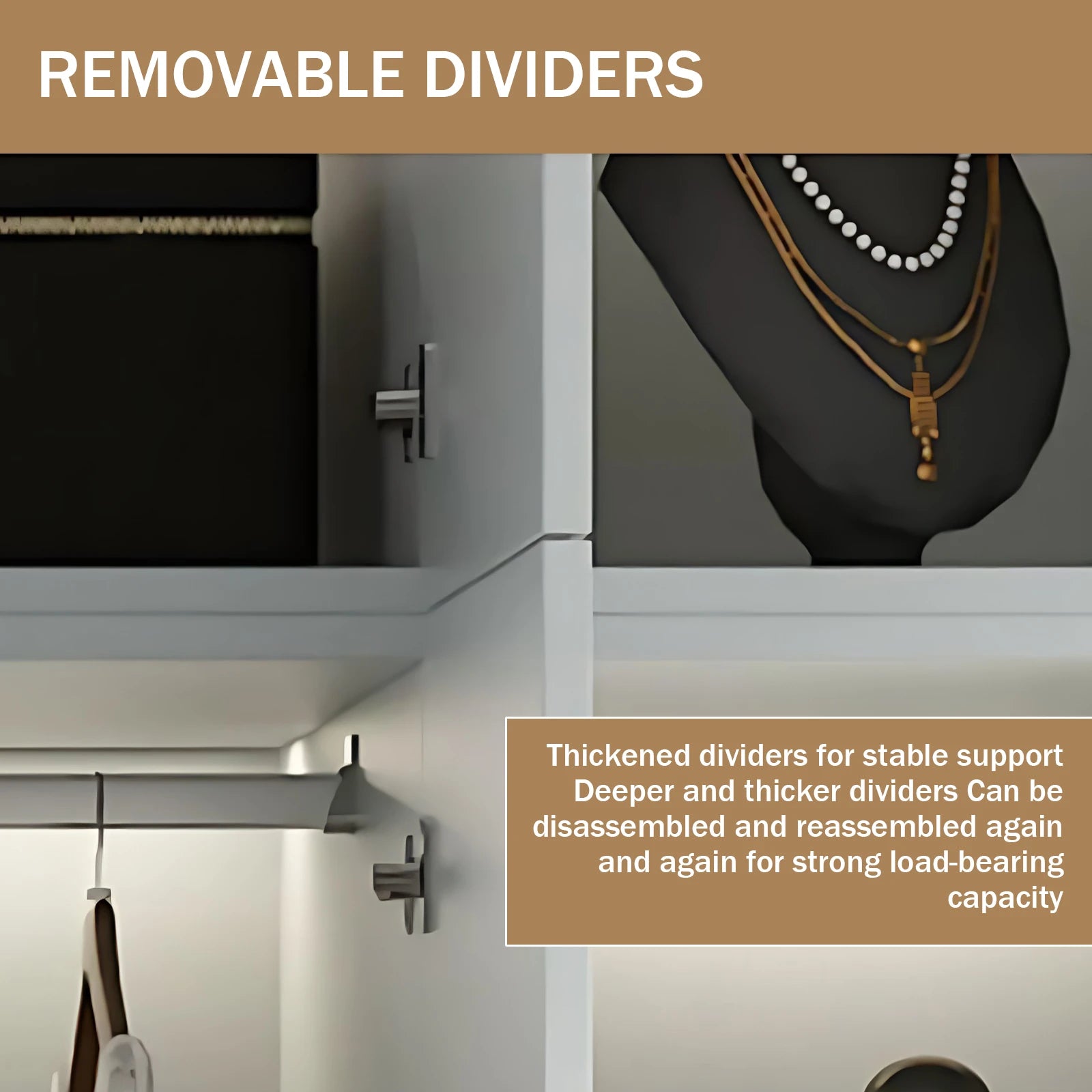 Intelligent Four-Partition Storage System: Experience the magic of organized life: dedicated hanging areas, multi-layer shelves, deep drawers and hidden compartments, scientifically store clothes, bedding and suitcases, so that every item can find an ideal home.