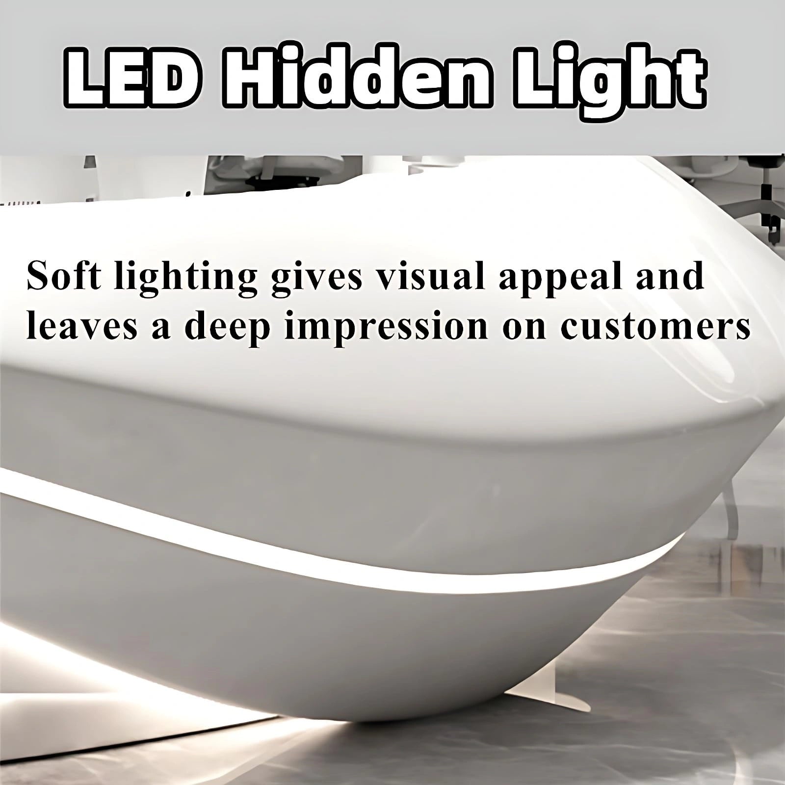 Integrated Hidden LED Lighting: Featuring soft LED lighting seamlessly embedded into the reception counter, this desk creates an inviting ambiance. The smooth lines and minimalist aesthetic enhance the visual appeal of any front desk reception counter or workspace.