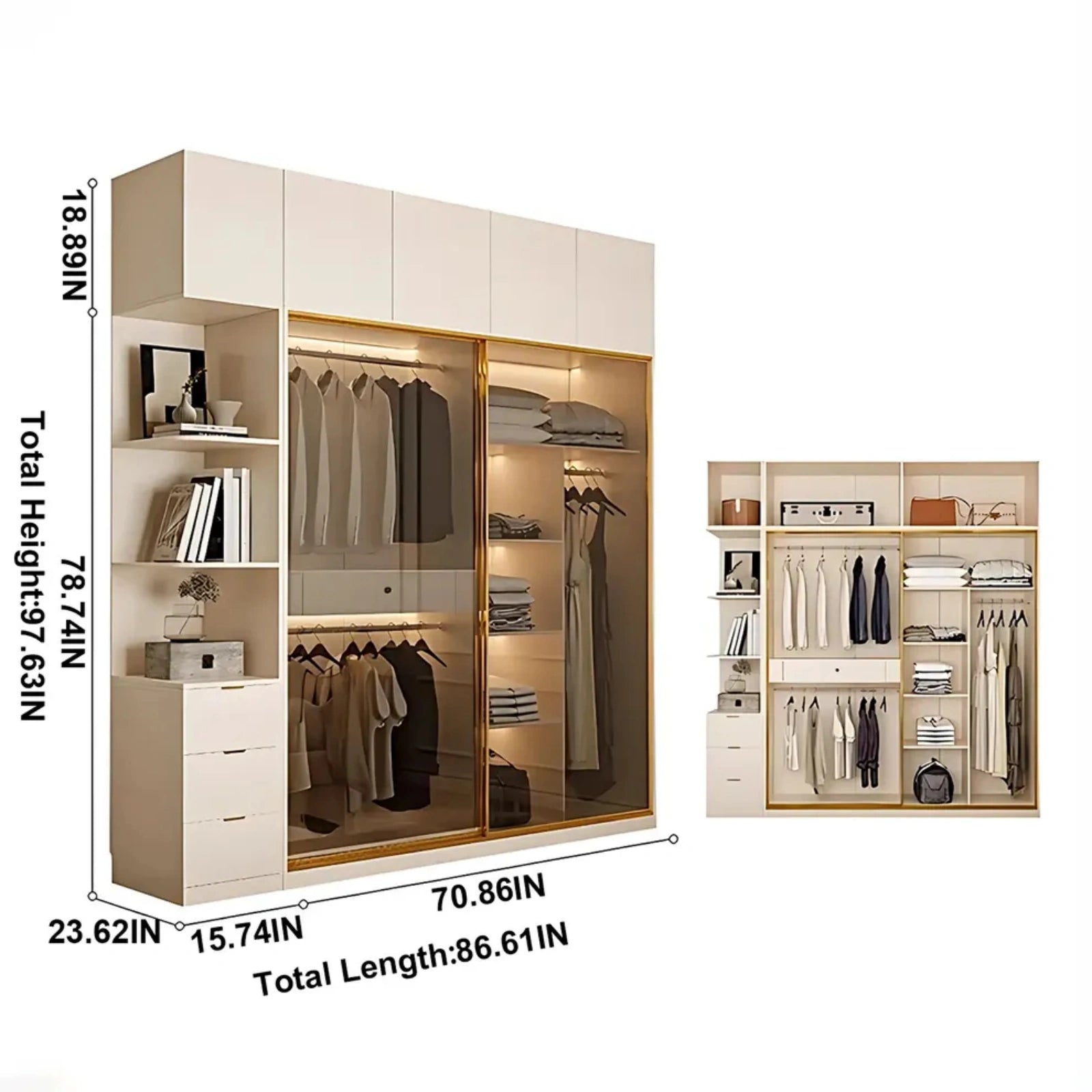 A Fusion of French Elegance and Modern Minimalism:The pure white cabinet body paired with brown tempered glass doors creates a light and airy aesthetic. The copper-colored metal frame and matte finish enhance the aesthetic. This cabinet inherits the romantic carved lines and soft tones of French style while infusing it with a modern, minimalist silhouette, perfect for bedrooms or walk-in closets