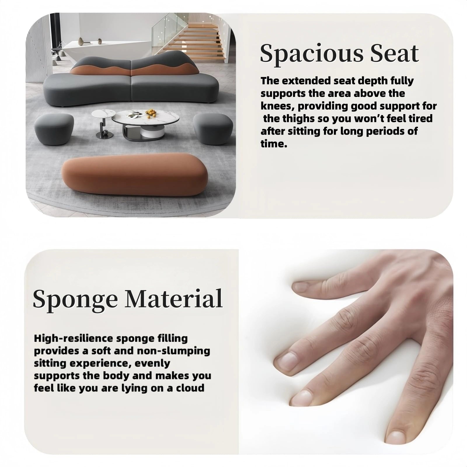 Unparalleled Cloud-like Comfort: Our signature cloud sofa is designed to fit the body's curves and has built-in lumbar support for an ergonomic relaxation experience. Soft, thick cushions and a sleek, modern silhouette create the ultimate retreat for movie nights, relaxing or elegant entertaining