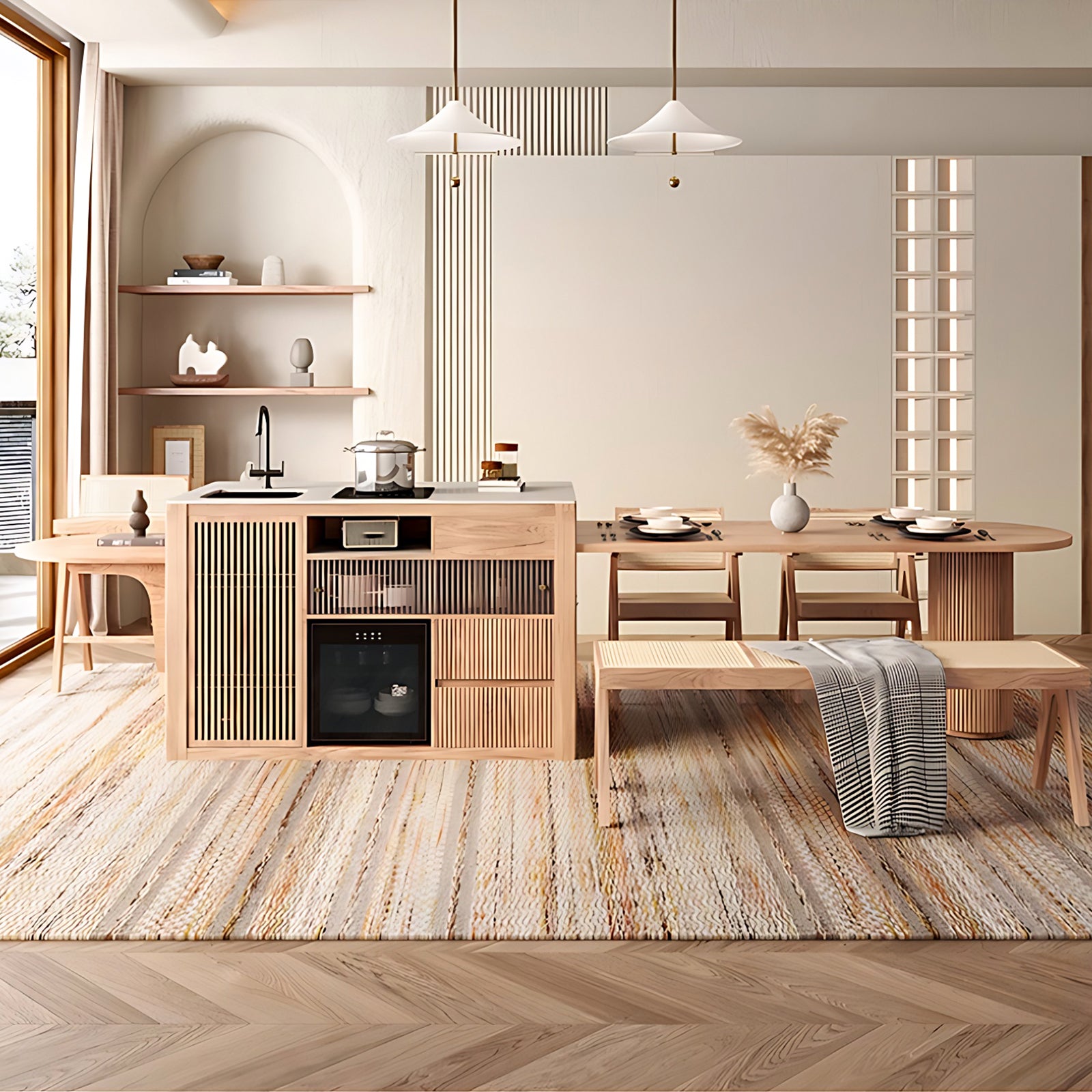 Modern Log Style: the island and the tabletop are integrated, the log color is fresh and natural, the wood grain is delicate, and the light gray tabletop and the log-colored island table are harmoniously matched to various decoration styles