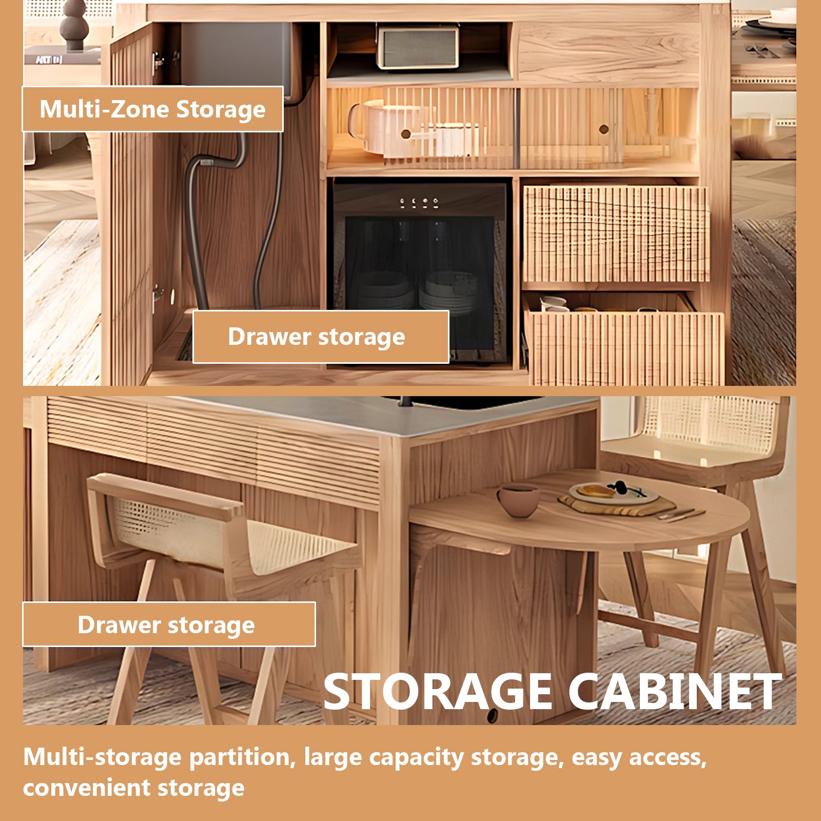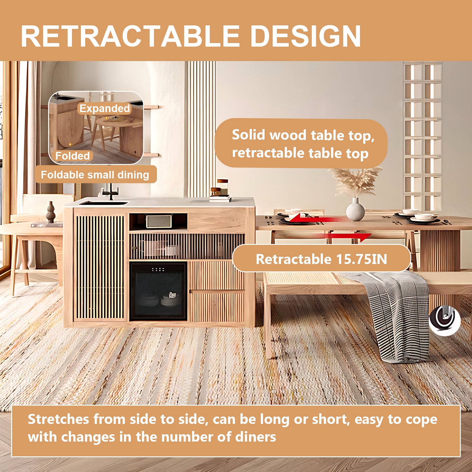 Retractable Dining Table: this model is an integrated design of dining table island and table;the table can flexibly adjust the size of the table according to the number of people eating, so it can be easily handled for both daily meals and parties