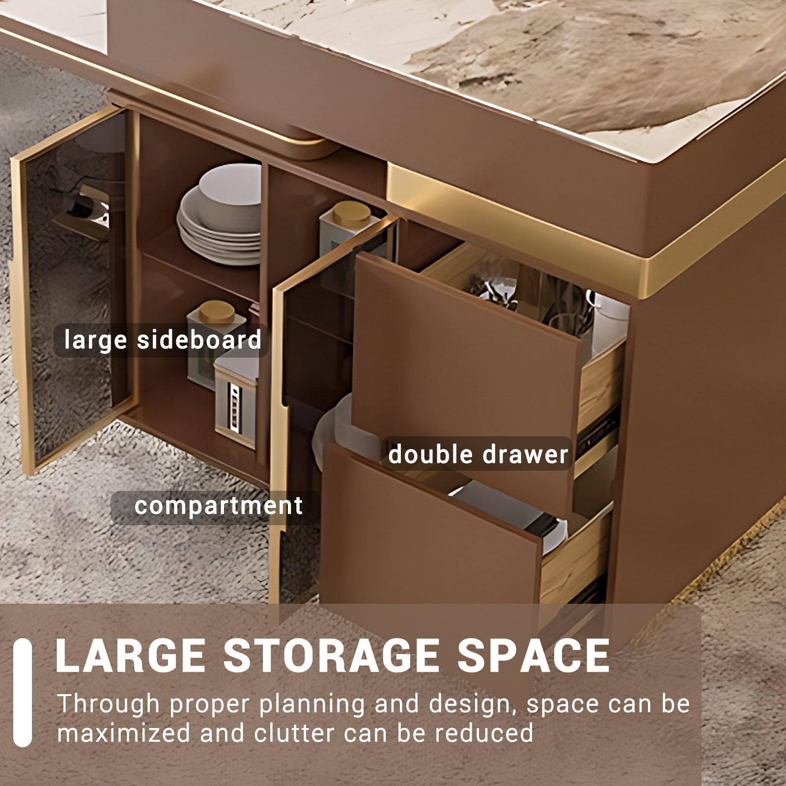 Unique Design: The table legs adopt a metal cross hollow structure, seamlessly integrating with the metal frame on the island and complementing the visual glass storage space. The desktop features fashionable patterns, which are unique and fashionable