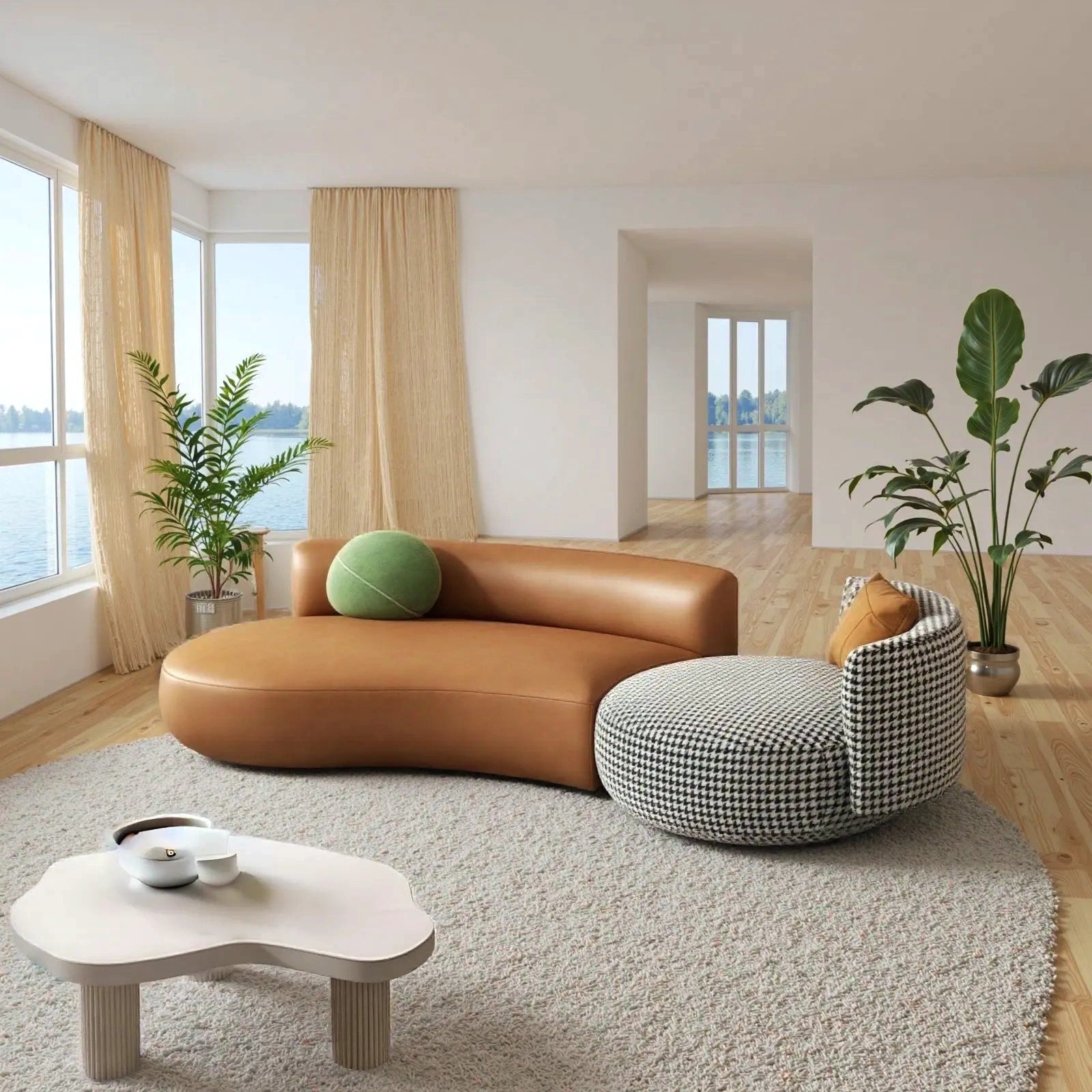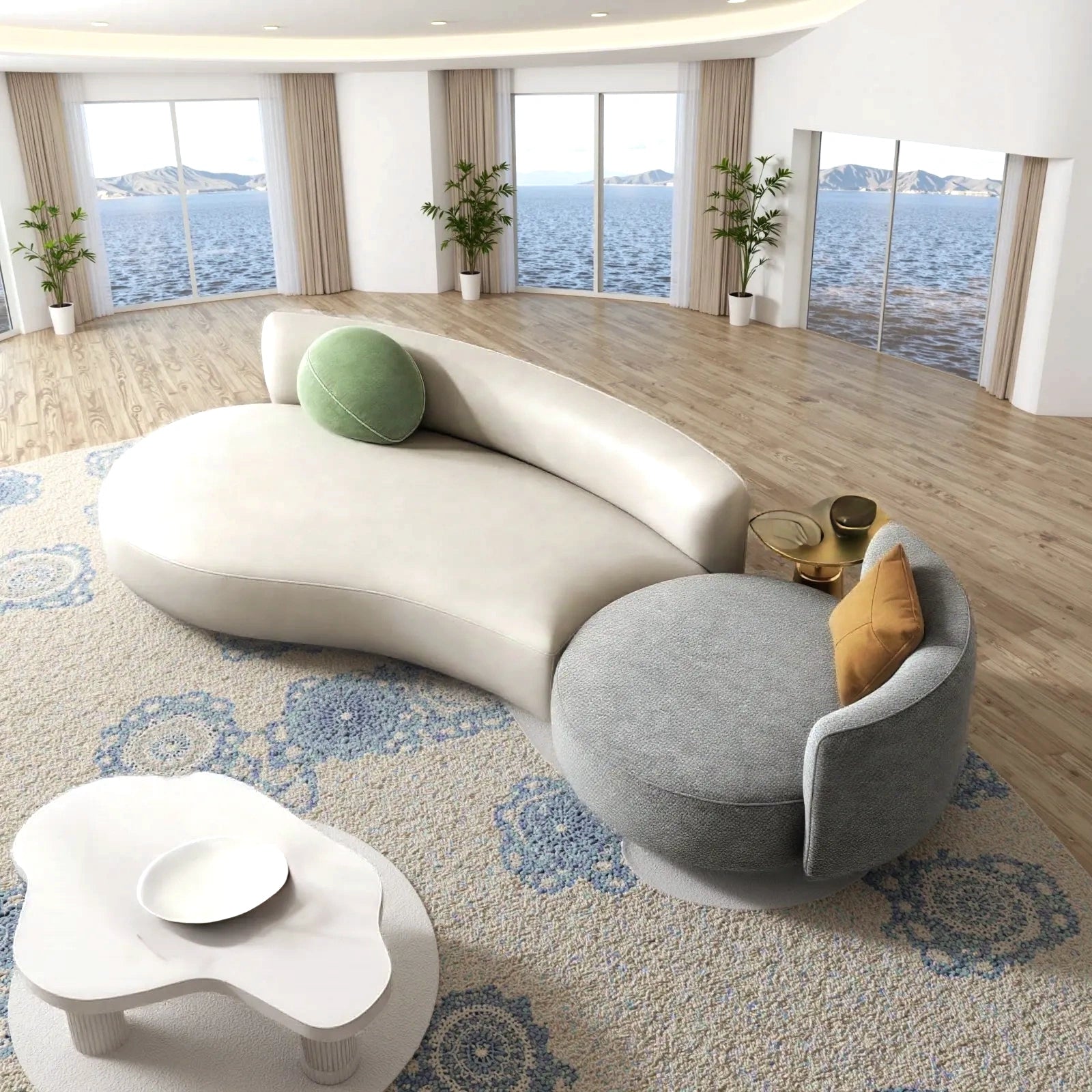 Modern Curved Sectional Sofa Set with Coffee Table:Transform your space with this stylish modular set, featuring a contemporary curved sofa and two sleek stone-top coffee tables. Designed for versatility, it effortlessly adapts to living rooms, offices, lounges, or cafés—blending premium comfort with modern aesthetics.