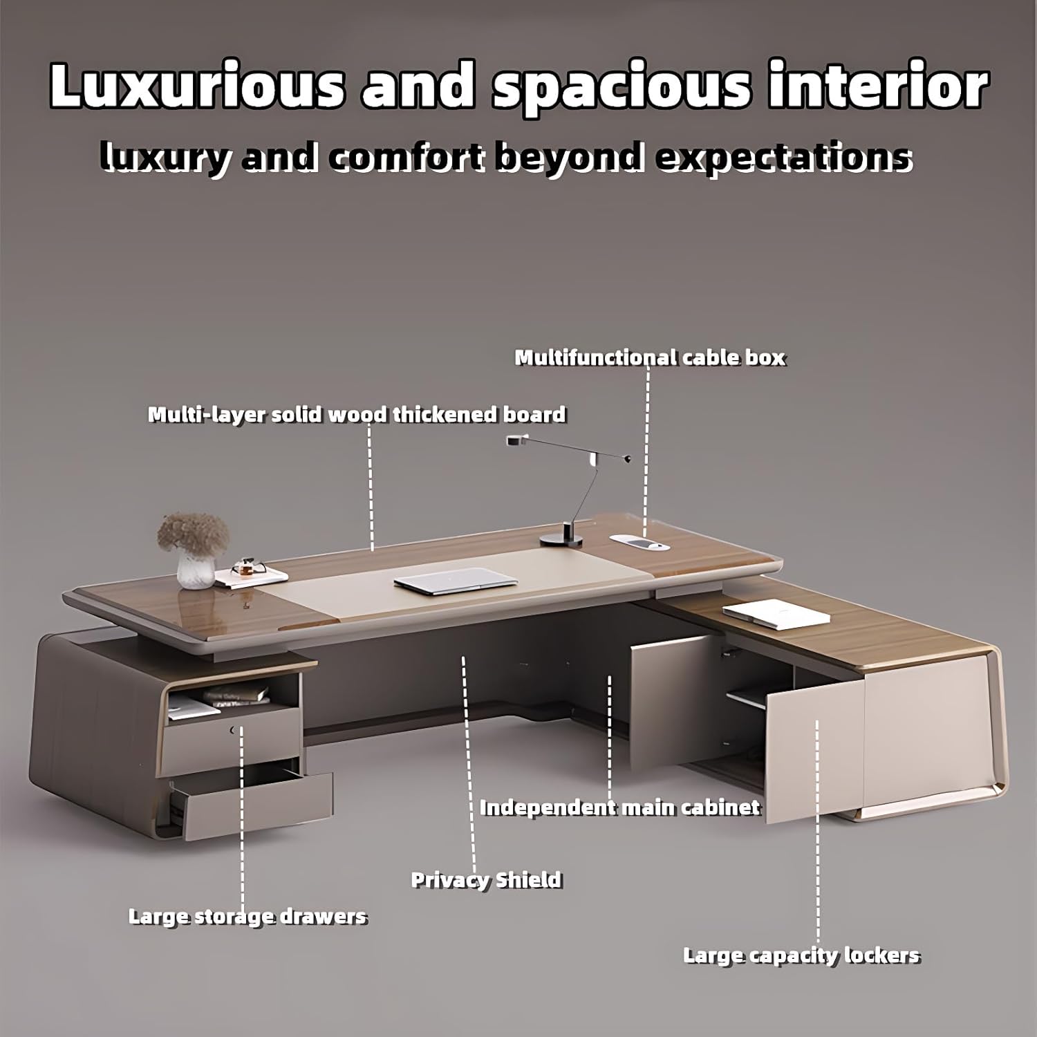 Smart Connectivity Design: This executive desk features integrated cable management and a ventilated CPU compartment, ensuring organized wires and optimal airflow for your devices. The thoughtful layout promotes both workspace efficiency and equipment longevity.
