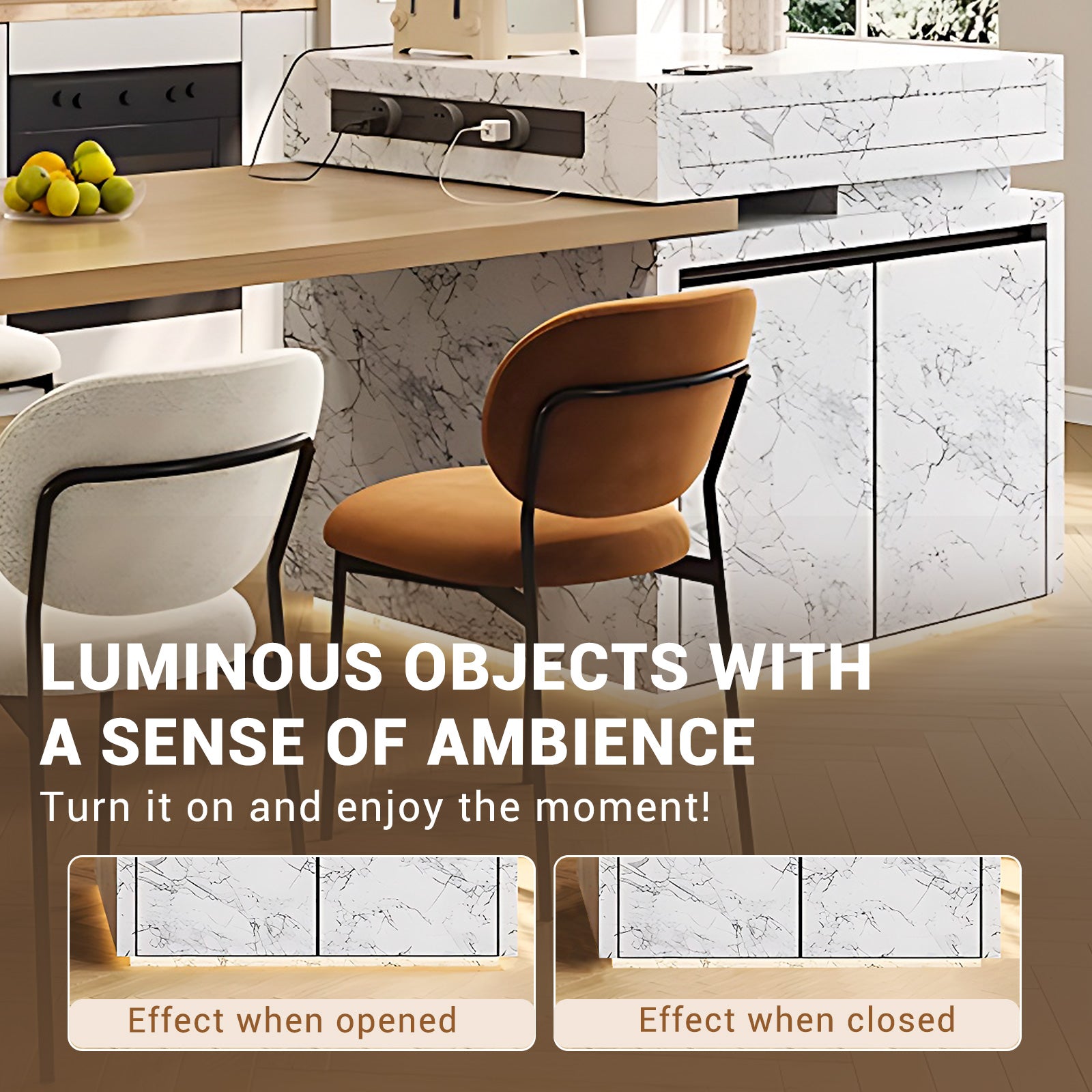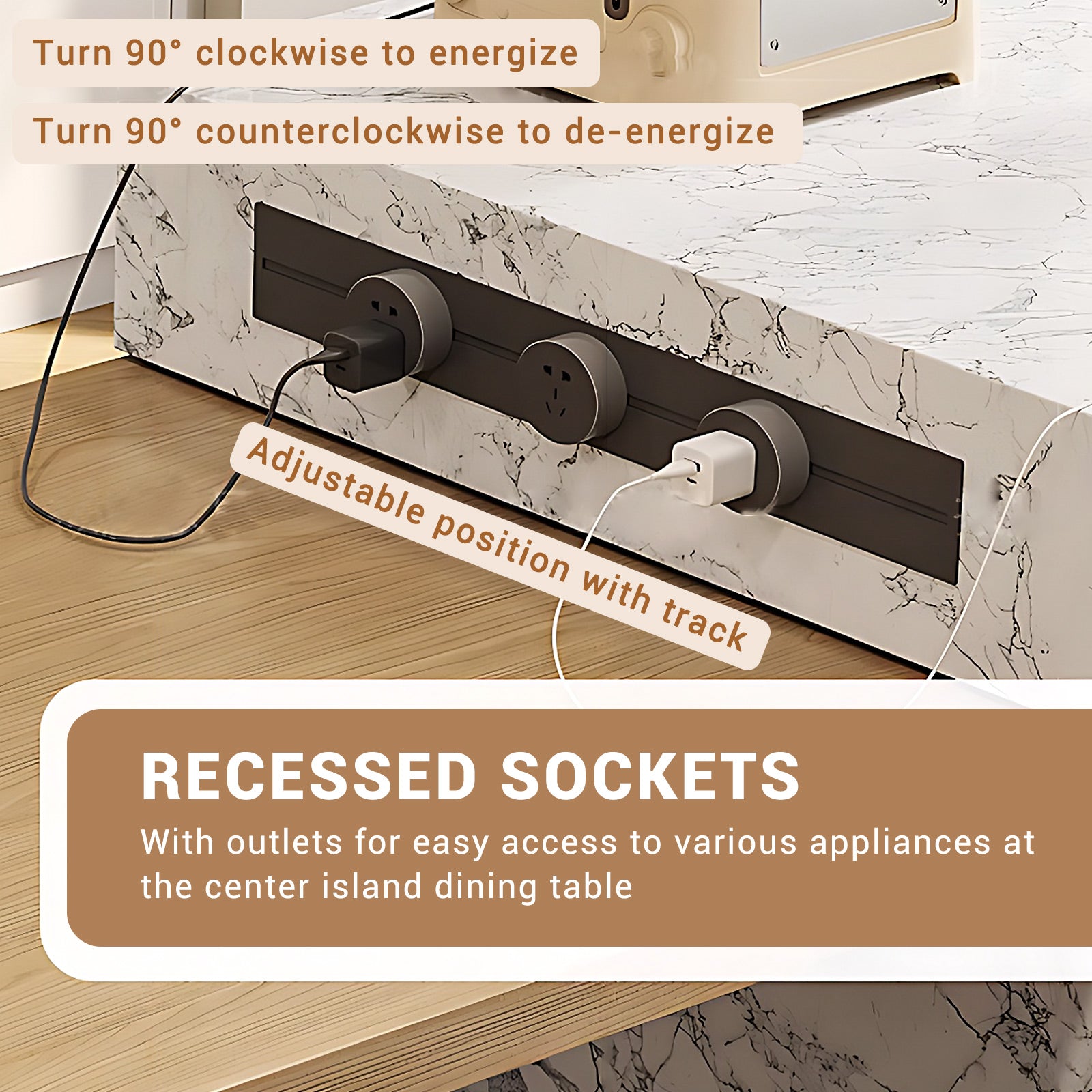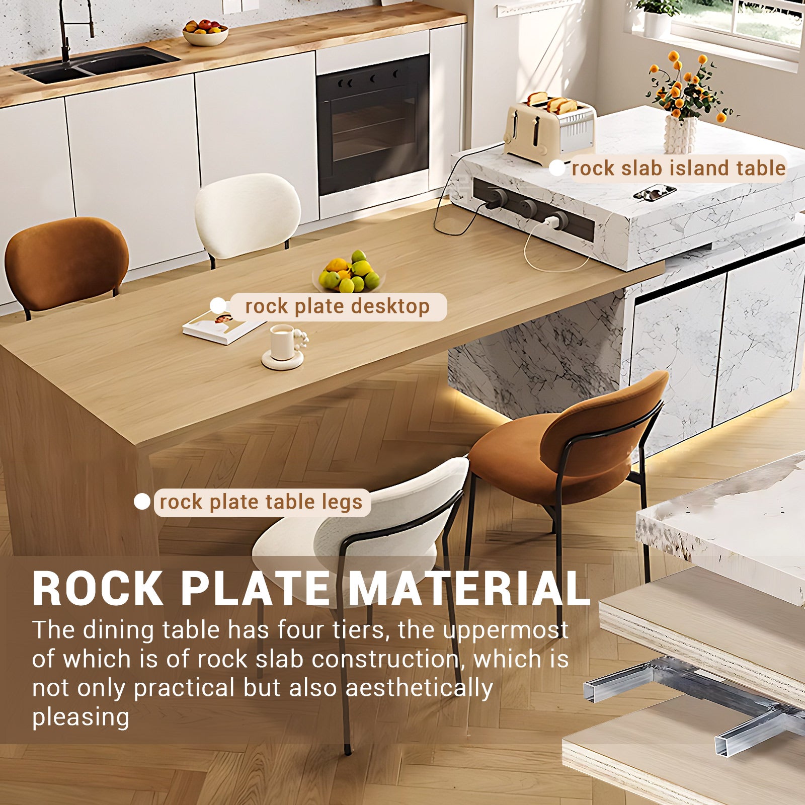 Exquisite Craftsmanship: The exterior of the dining table and the upper part of the island are made of sturdy rock slab materials, known for their strength. The lower part of the island platform and the interior of the dining table are made of solid wood