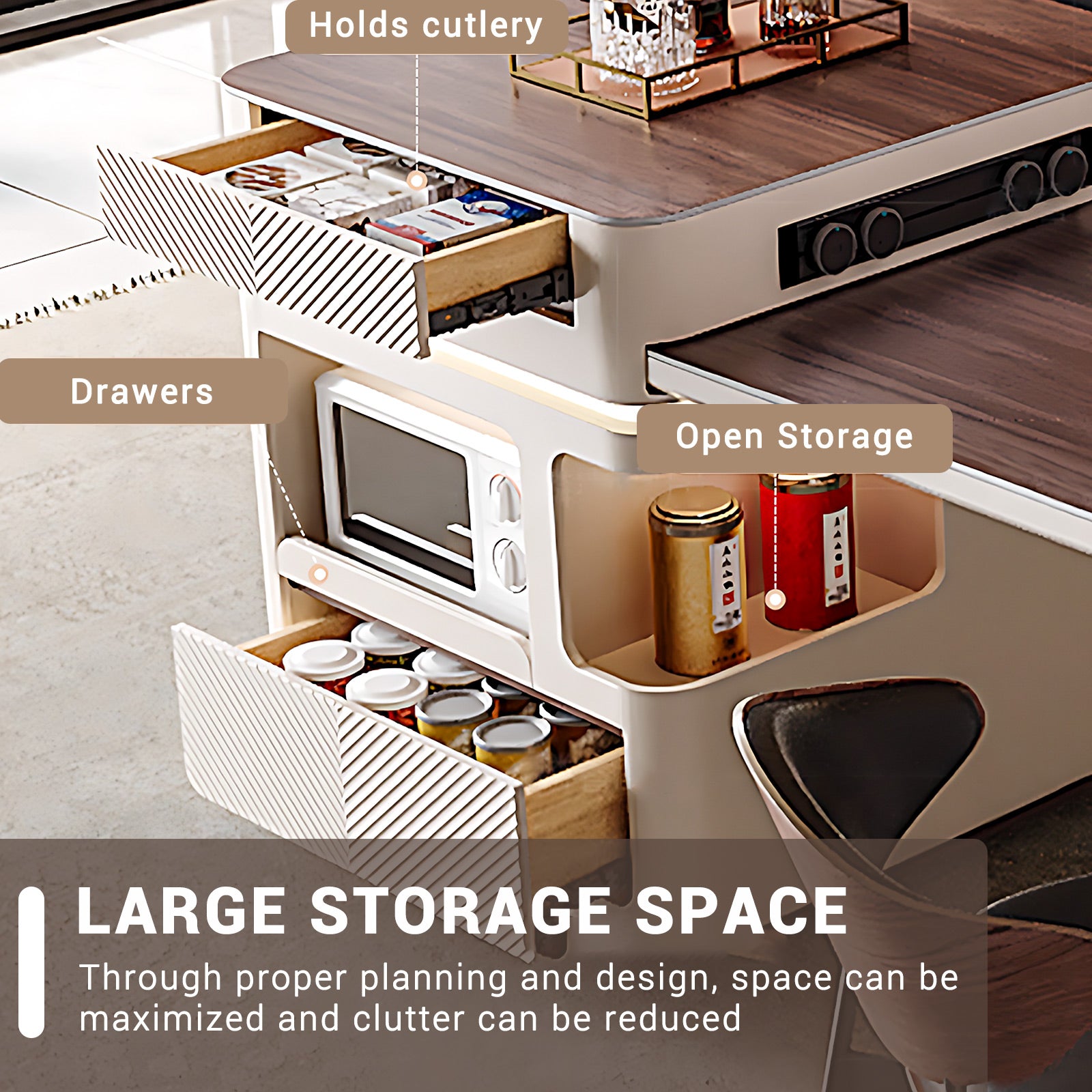 Spacious Storage Space: The island platform features open storage compartments and lockers, providing ample space to store cutlery and various other items. The island countertop can also conveniently store water bottles, etc