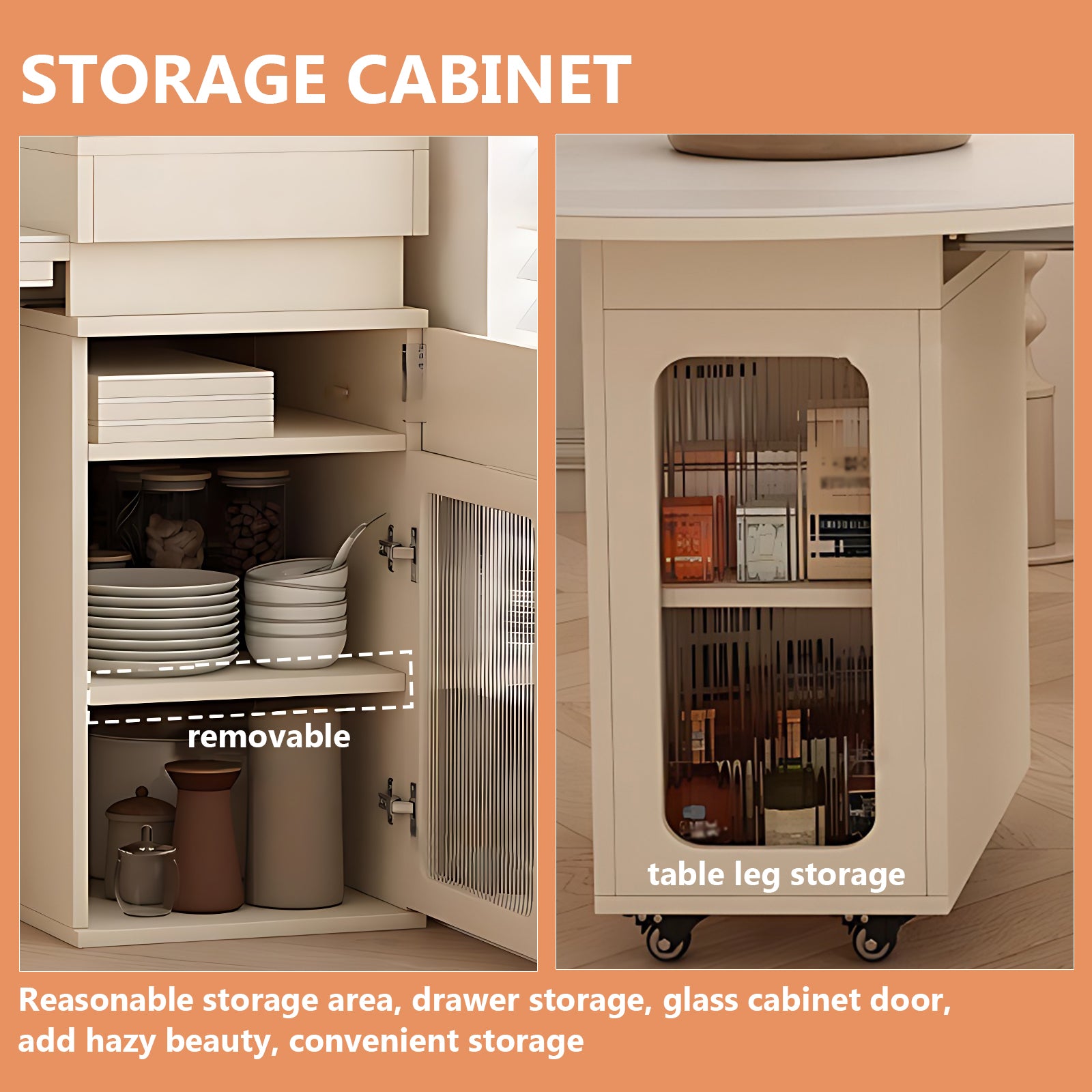 Light Luxury Style:the overall color is milky white, and the table legs are made into retractable glass door cabinets; the tabletop shape can be changed as you like, and every line is elegant and moving