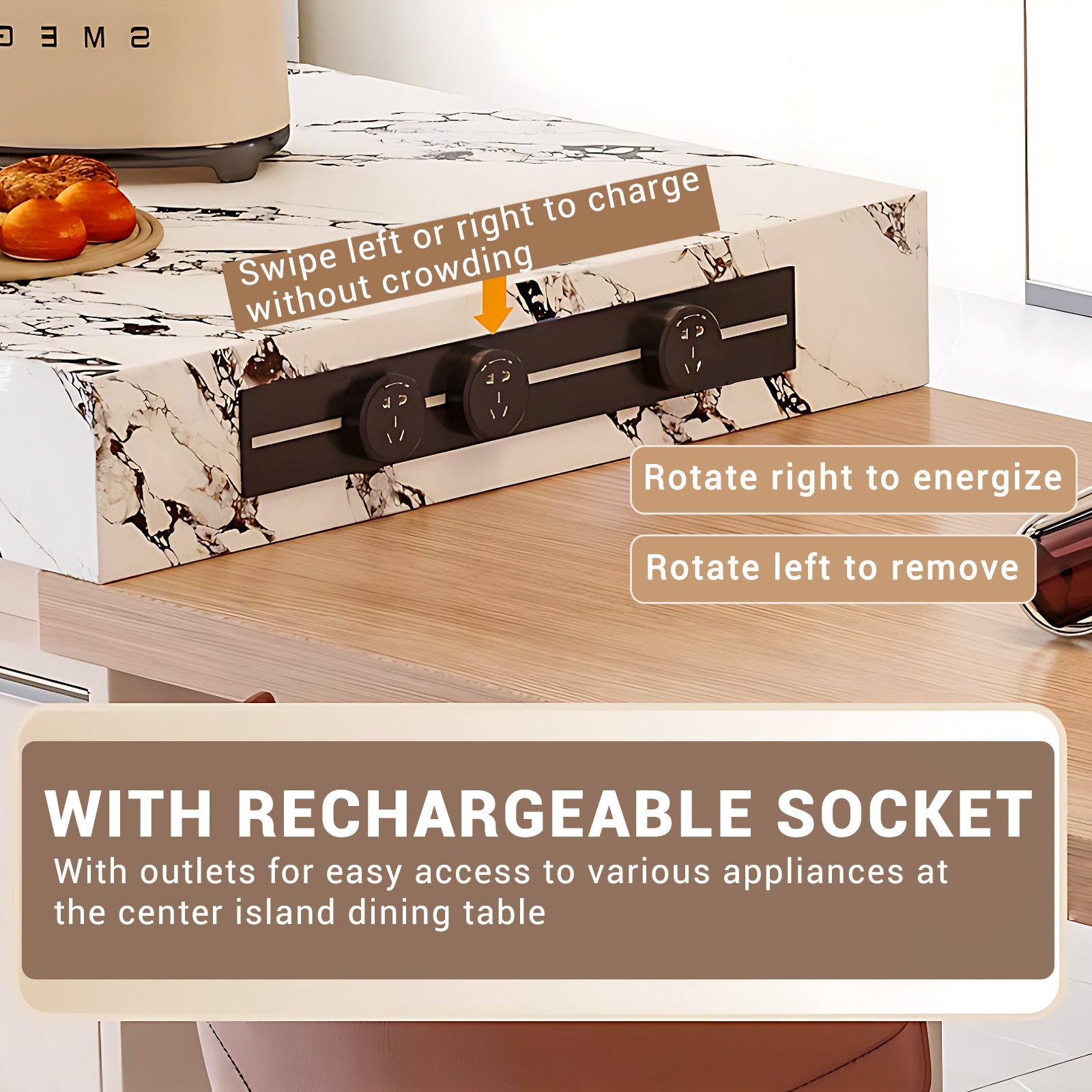 Thoughtful Feature: Our island platform features a carefully designed socket on the side for easy device charging, demonstrating practicality. In addition, the table legs can be equipped with wheels for easy movement and repositioning of the dining table