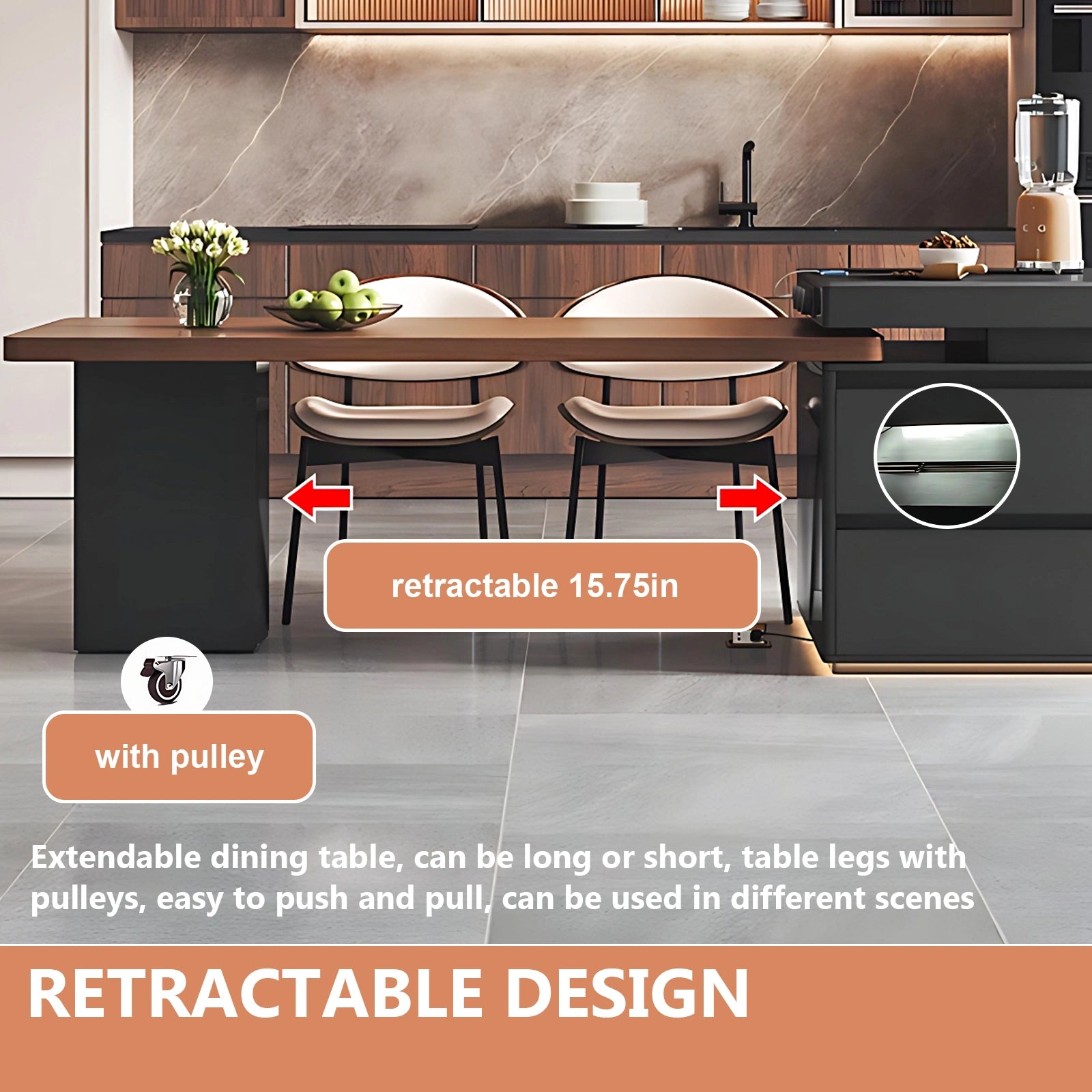 Retractable Dining Table: this model is an integrated design of dining table island and table;the table can flexibly adjust the size of the table according to the number of people eating, so it can be easily handled for both daily meals and parties