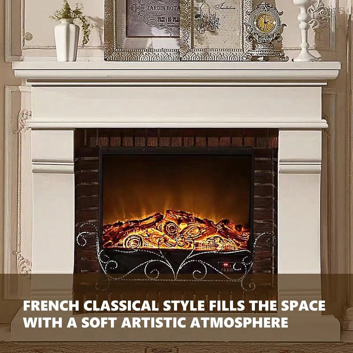 French Classical Style: Smooth lines and symmetrical columns, carved decorations on the top, realistic flames dancing in the fireplace, and intricate ironwork patterns add a touch of elegance, creating a romantic, warm and sophisticated atmosphere