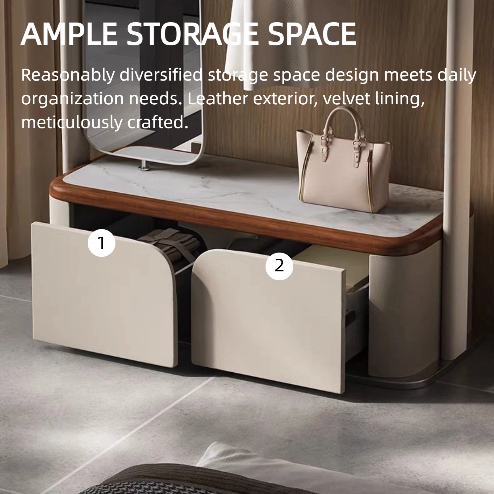 Large Capacity Storage: Boasts two drawers with leather finishes and soft velvet interiors for protecting your items. Additionally, there's an open storage countertop, offering convenient space for placing daily essentials or decorative pieces