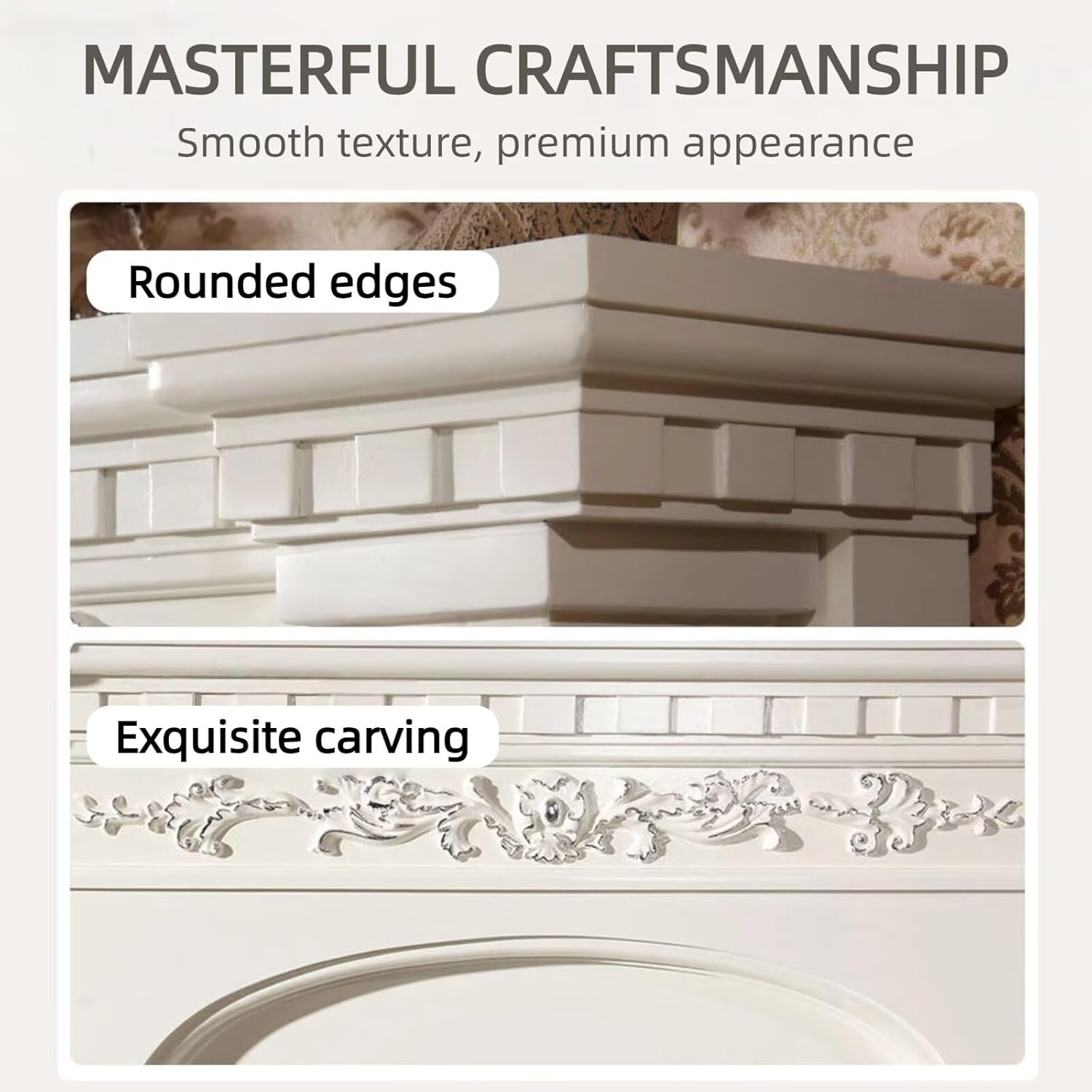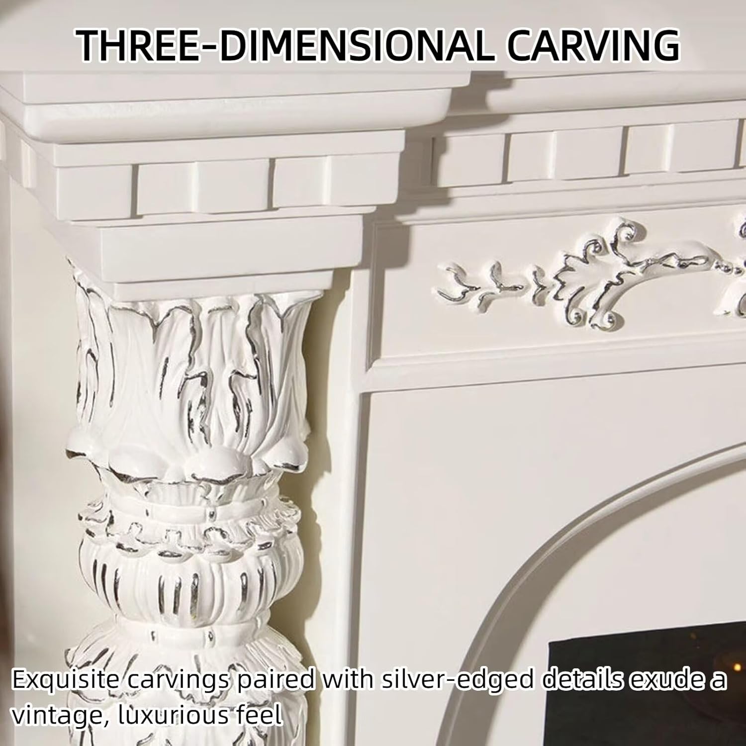 Exquisite 3-Dimensional Carving: Detailed 3D carvings, including elegant column accents, floral patterns, and graceful scalloped edges, are paired with fine silver trim to exude a rich vintage aesthetic.