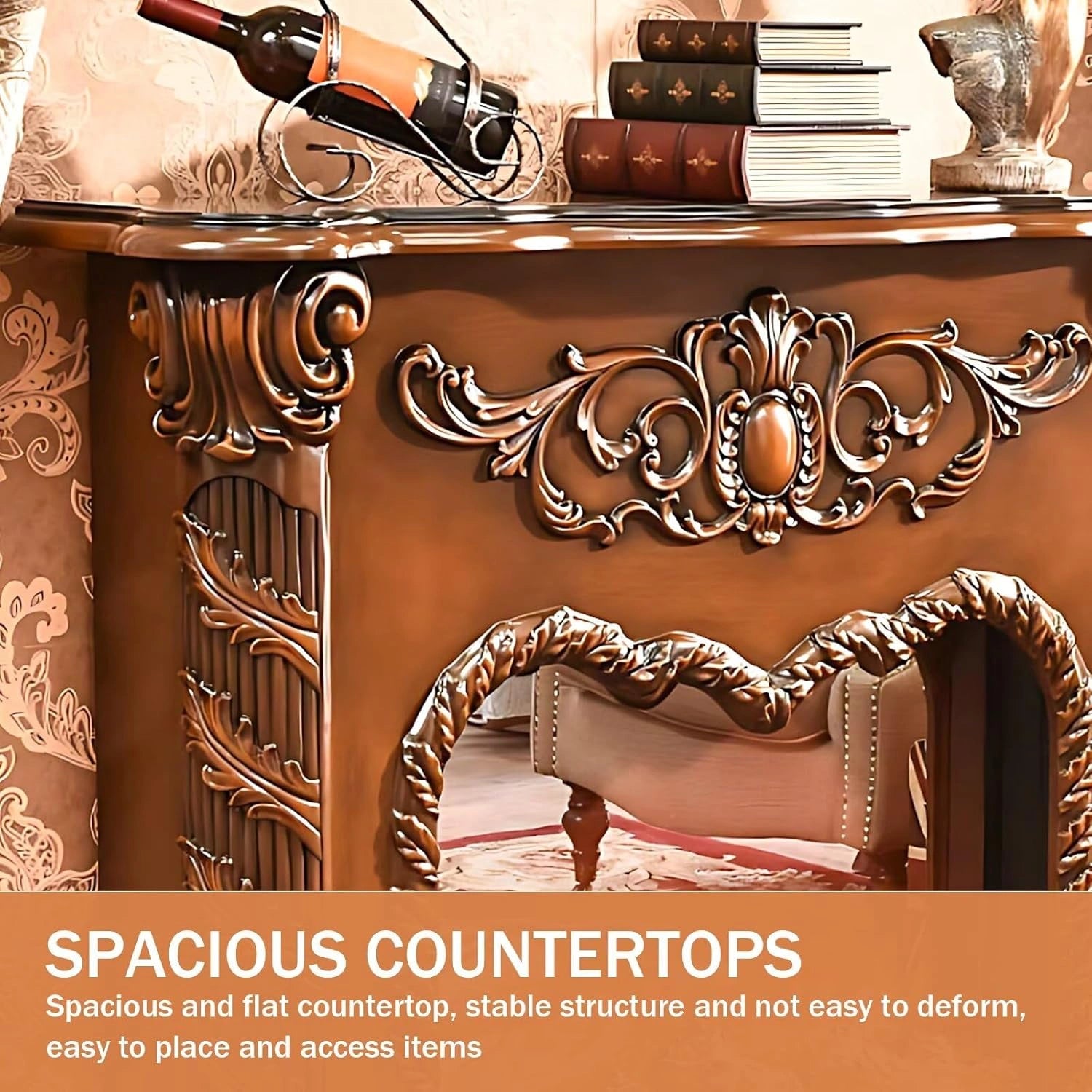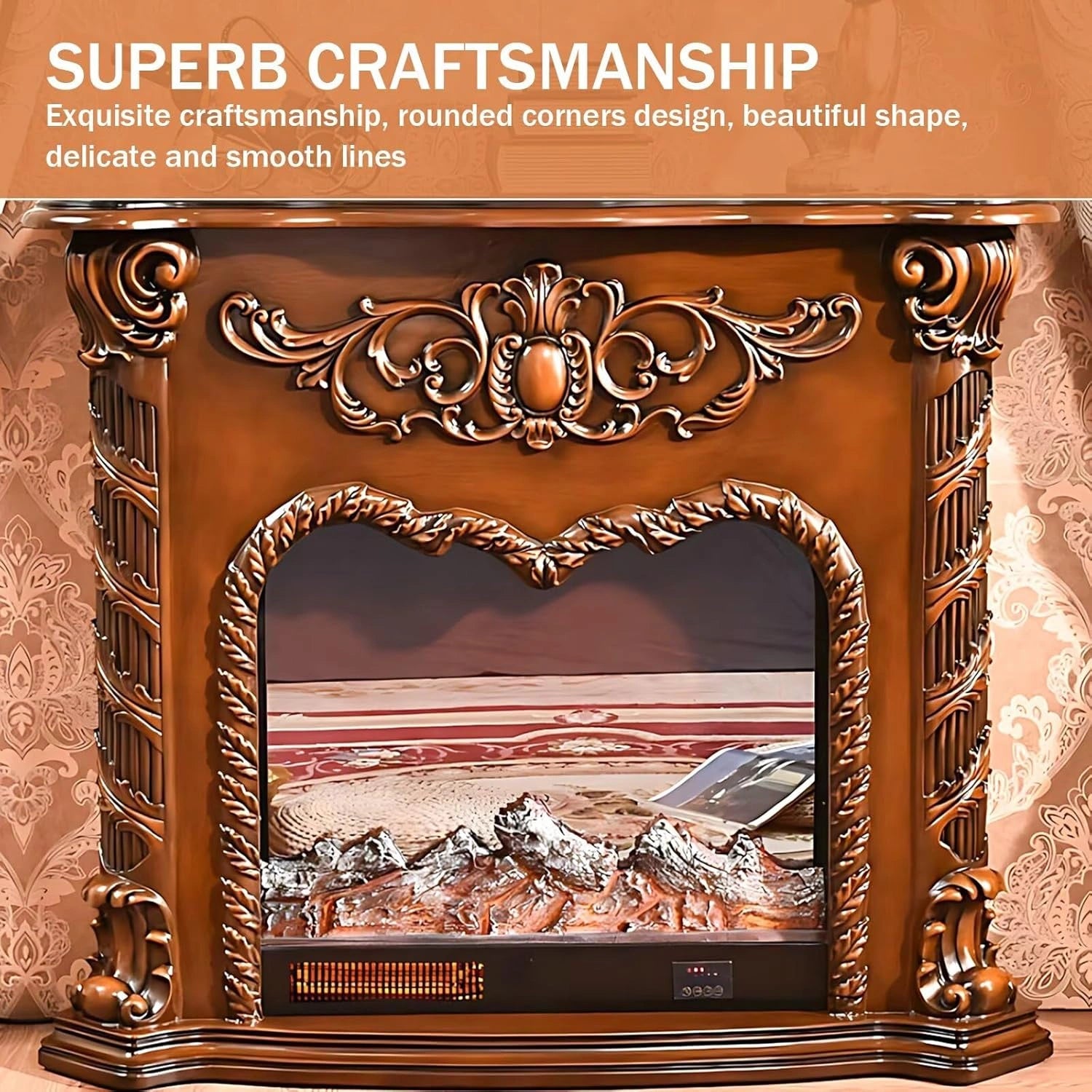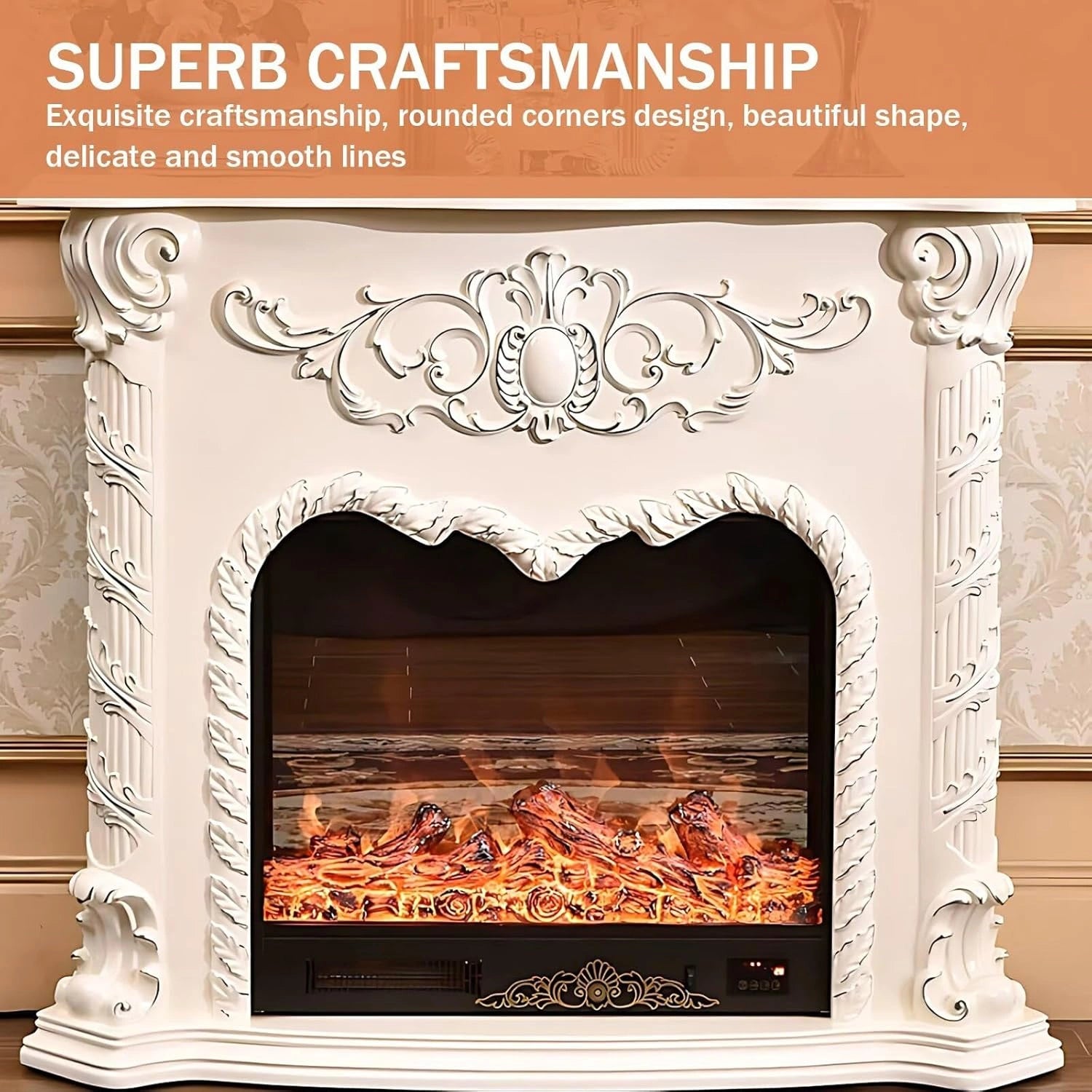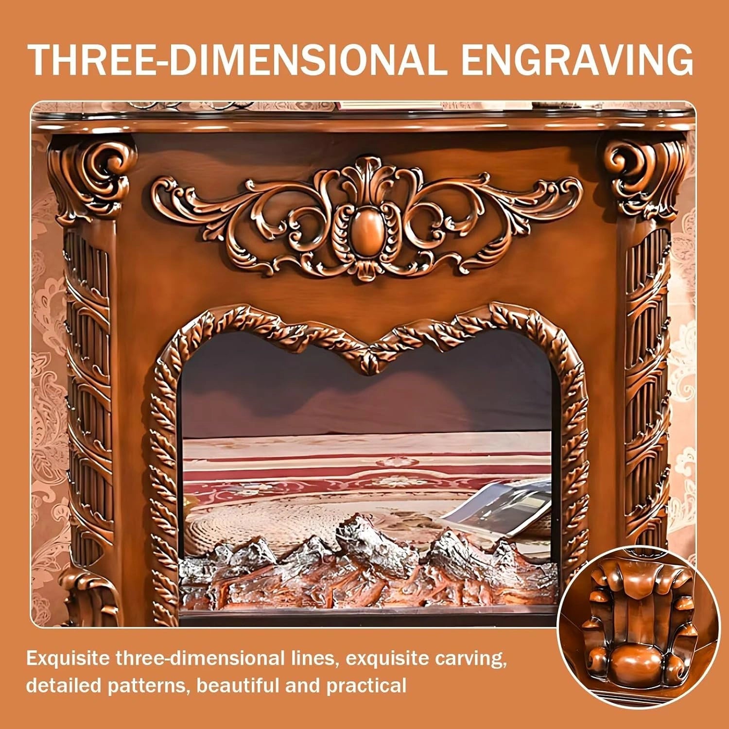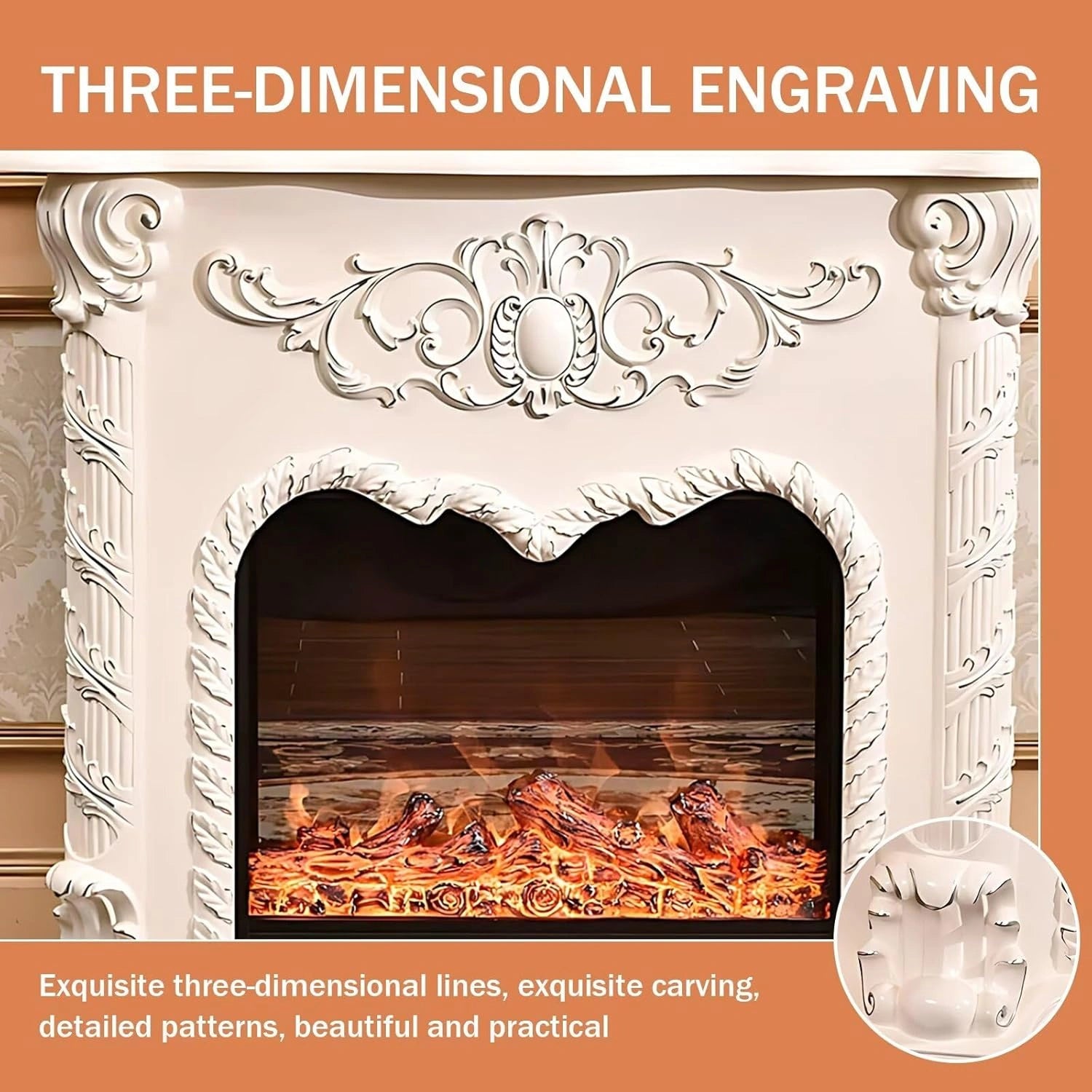 Unique Design: The center of the fireplace is decorated with an elegant symmetrical pattern, exuding a magnificent momentum. On both sides, there are complex twisted columns carved with spiral patterns, which are more unique and exquisite
