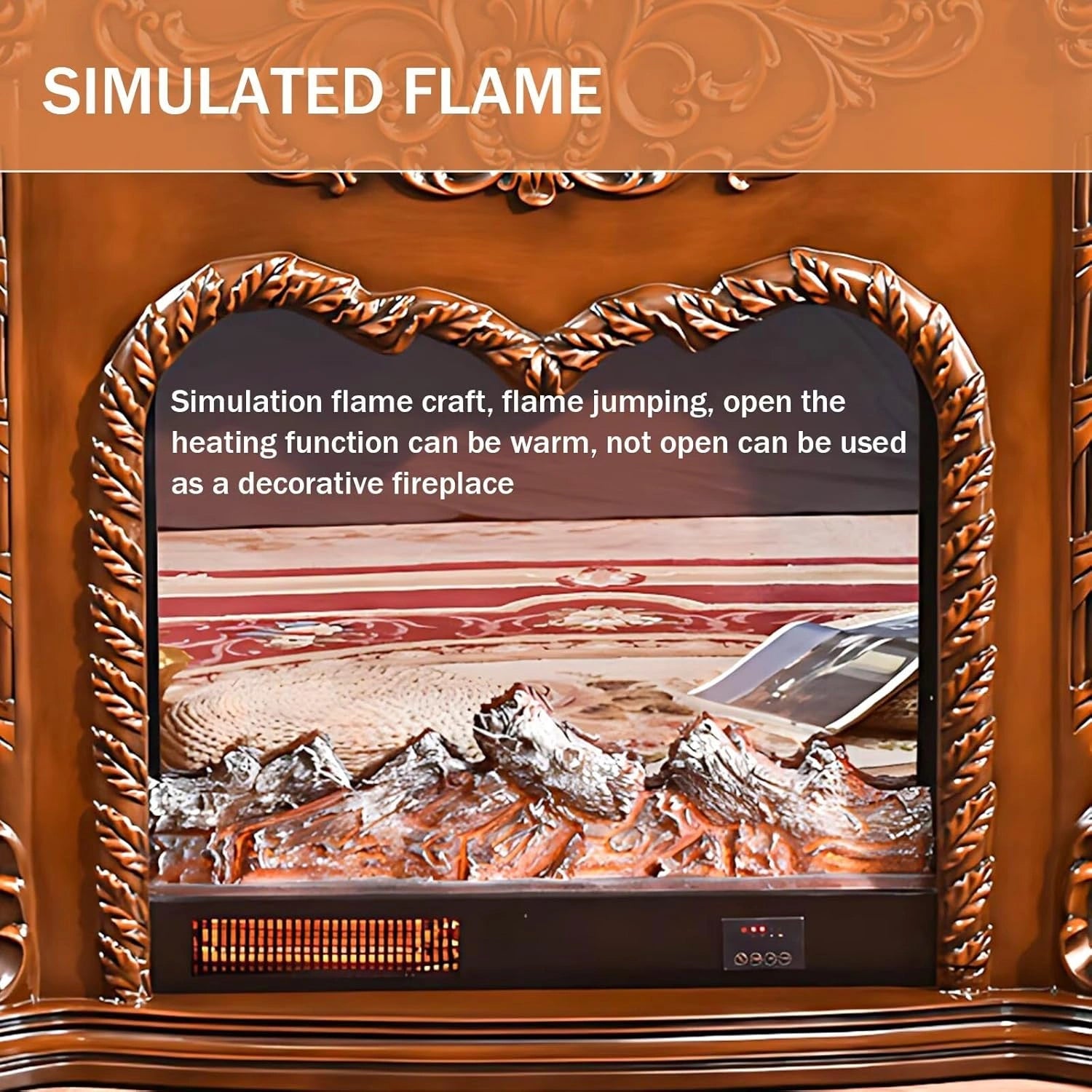 Heating Fireplace: With remote control, realistic flame effect; turn on the heating when needed, turn off when not needed; the decorative flame is 15-30W; the heating flame is 750-1500W, which can be adjusted in two levels