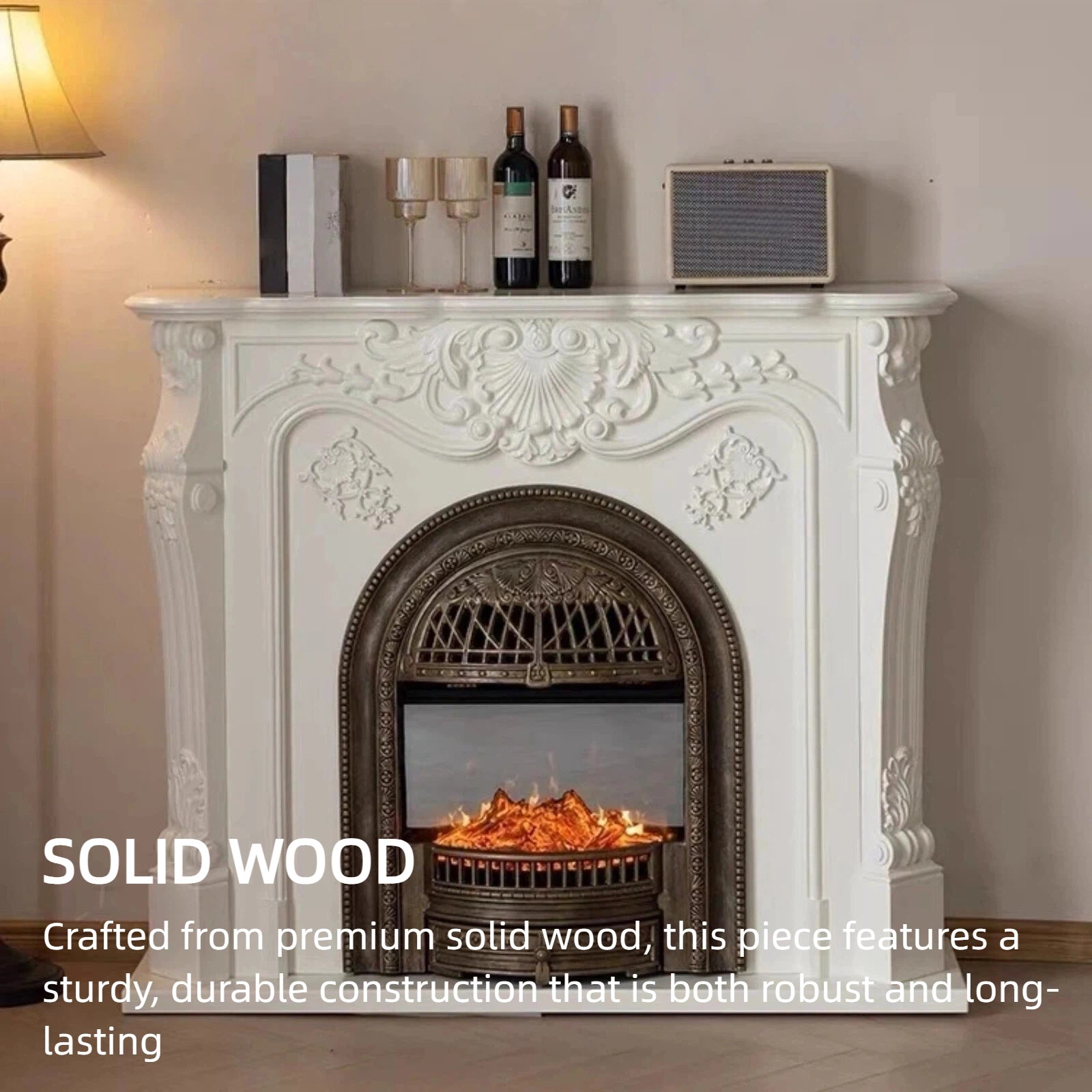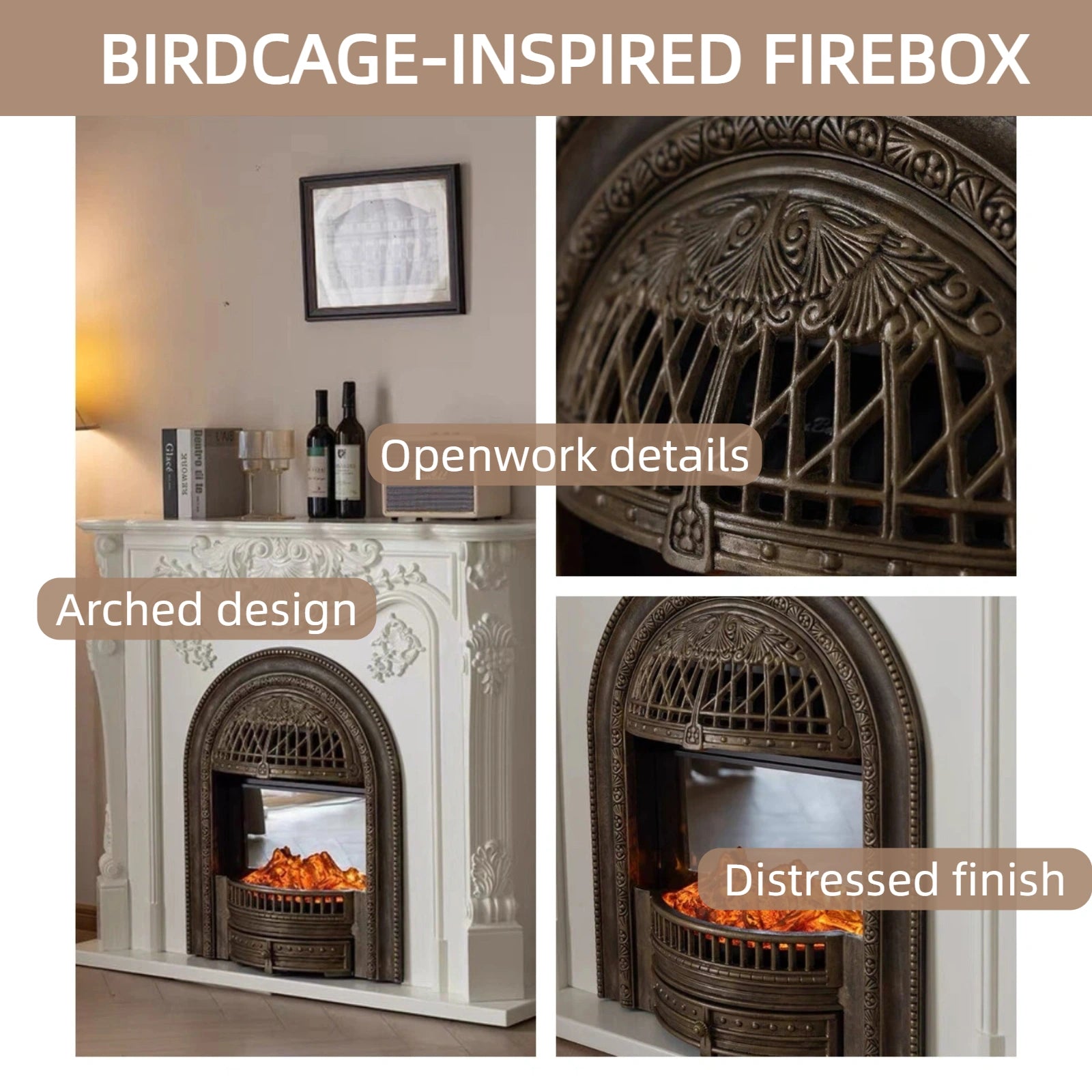 Exquisite Craftsmanship Details: The birdcage-inspired firebox combines arched shaping with intricate carved and openwork elements. Its distressed finish adds a vintage look, creating visual interest