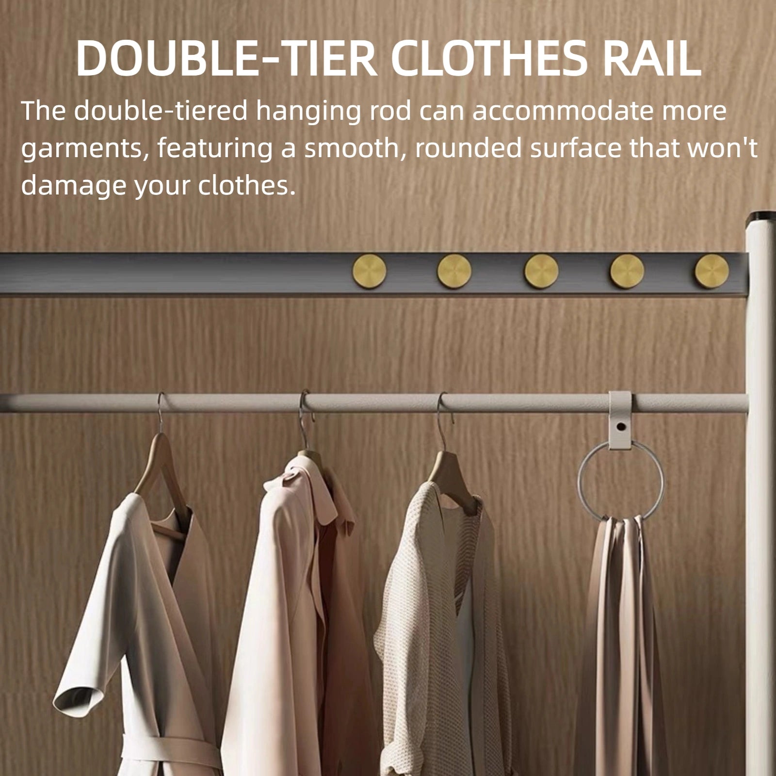 Double-Tier Rack: The dual-tier hanging rod design accommodates more garments. Featuring stainless steel hooks with smooth surfaces that won't snag or damage clothing. The 47.24-inch hanging height allows garments to hang vertically, minimizing wrinkles