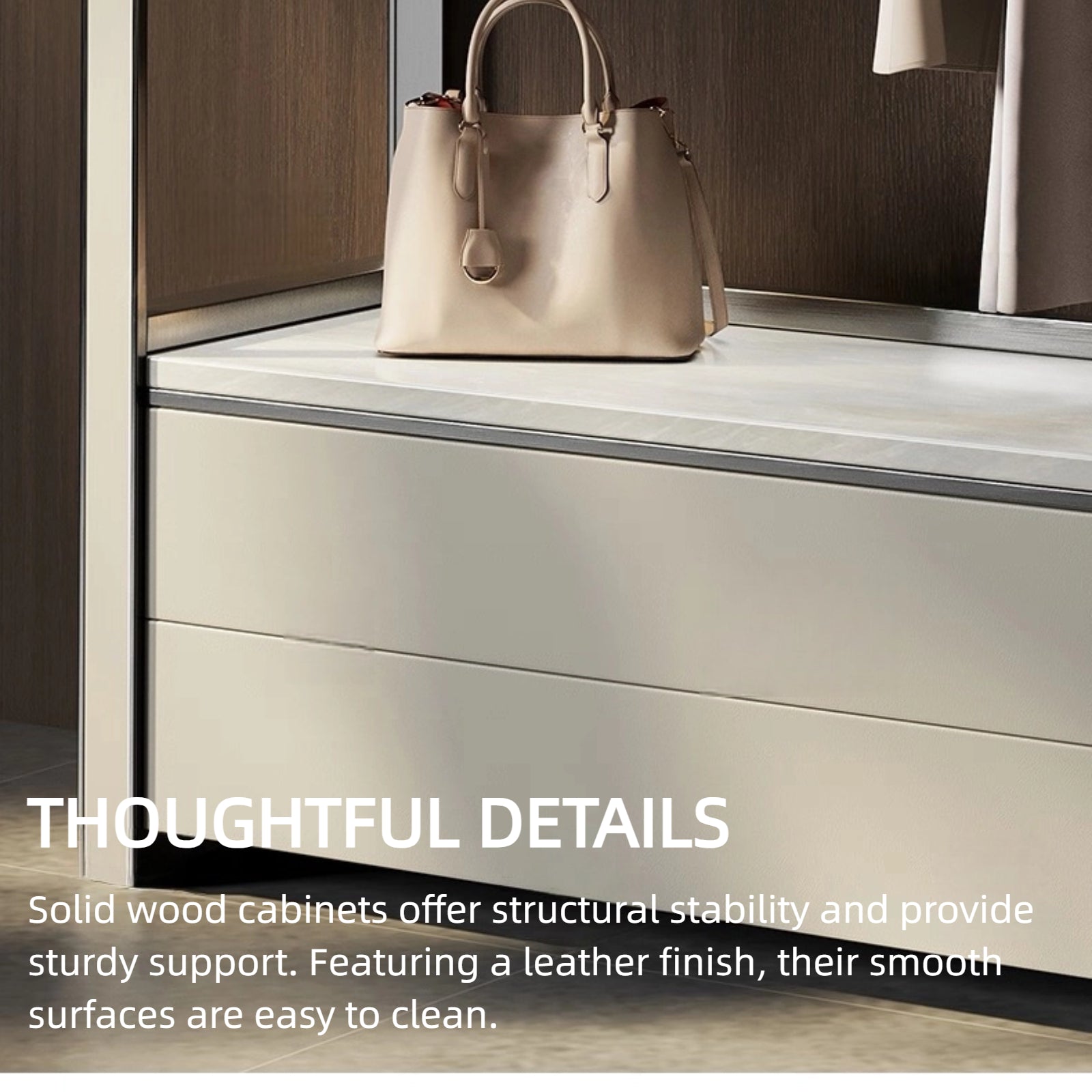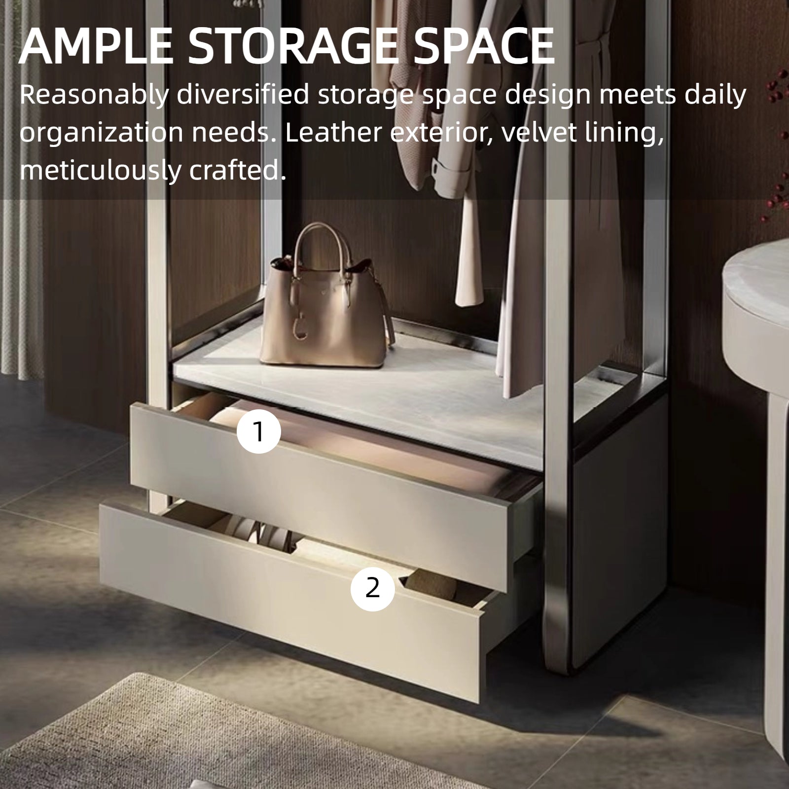 Ample Hanging Space: Equipped with double hanging rods wrapped in leather over aluminum alloy, along with multiple stainless steel hooks. The rods undergo an electroplated wire drawing process, ensuring a smooth surface that won't damage your clothes