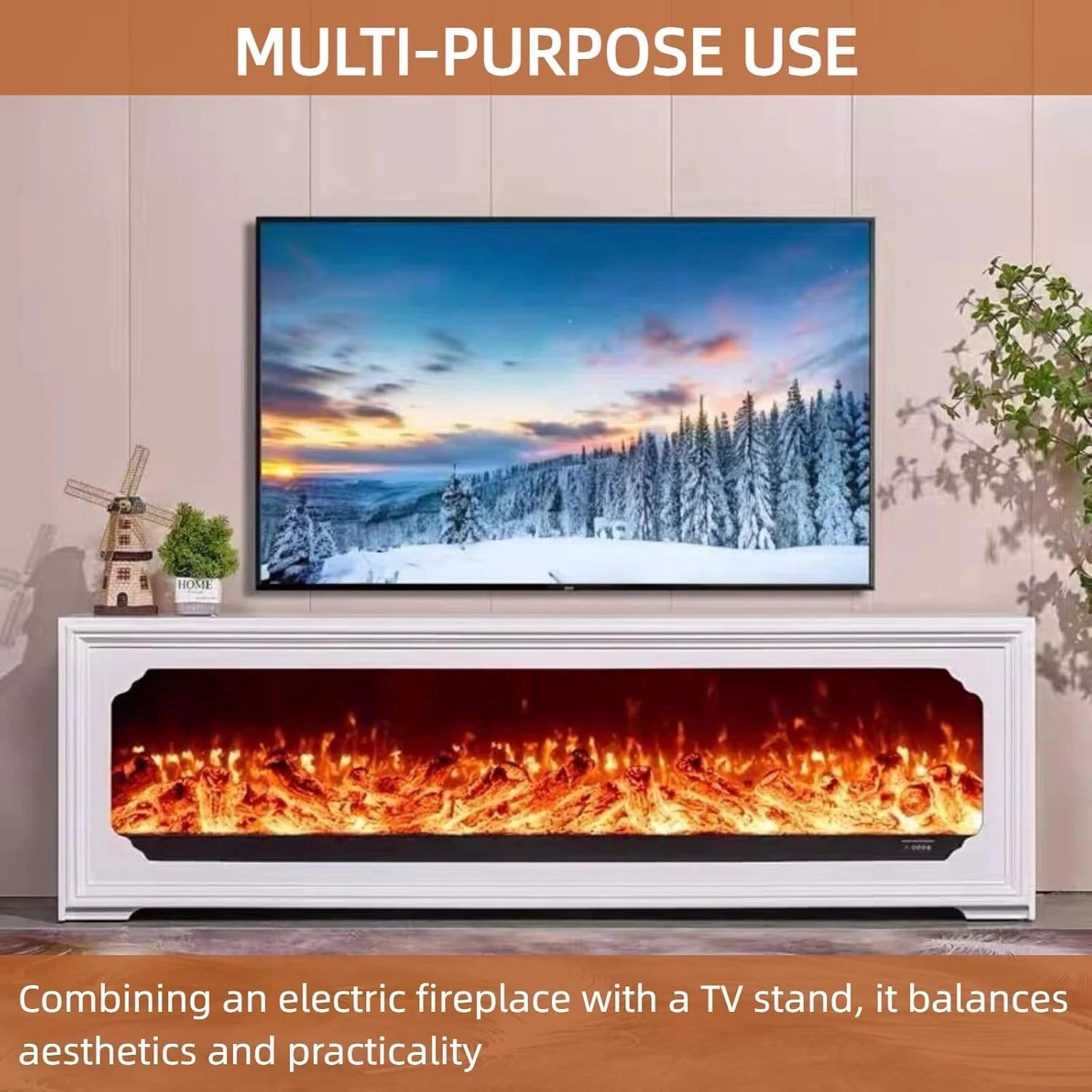 All-in-One Electric Fireplace & TV Stand: This 2-in-1 design combines an electric fireplace with a practical TV stand, perfect for living rooms or family rooms. Its spacious top surface doubles as a convenient storage area for everyday essentials.