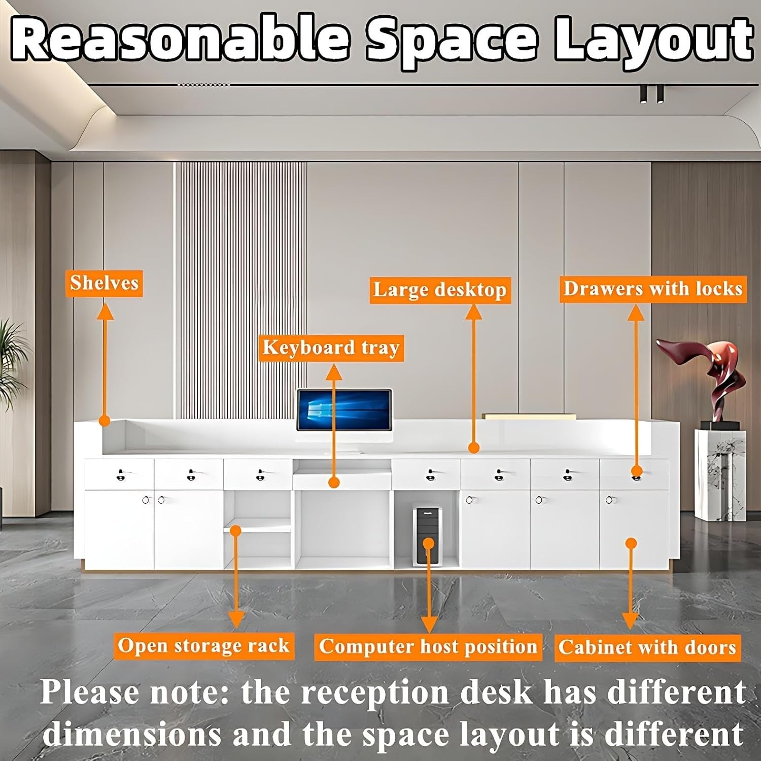 Versatile for Multiple Scenarios: Whether used as an office reception desk, a front desk reception counter, or in retail and hospitality environments, this receptionist desk adapts effortlessly to various settings with its modern and functional design.