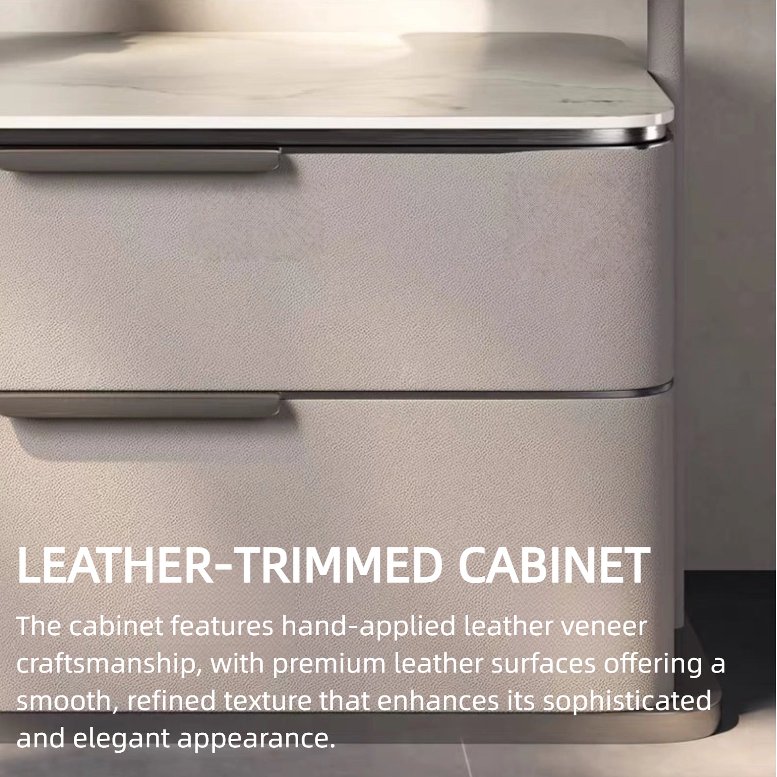 Good Material Selection: The stainless steel frame ensures stable structure. The solid wood storage cabinet has a soft leather finish and velvet interior, while the rock slab countertop boasts exquisite texture and a smooth surface for easy cleaning