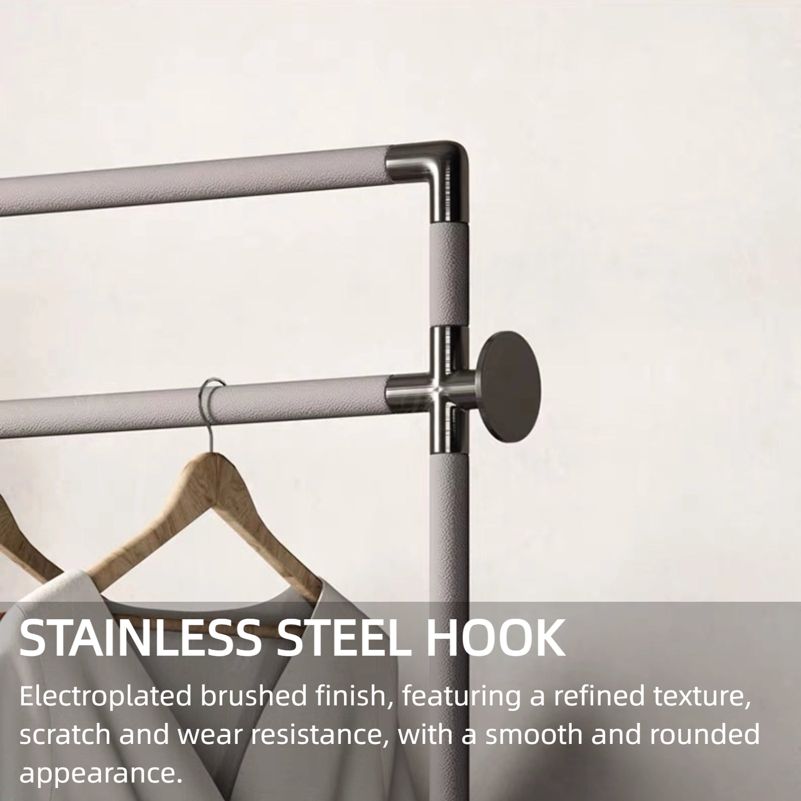 Large-Capacity Double Hanging Rods: Equipped with double hanging rods, it can hold more clothes to meet your storage needs for coats, dresses and other garments. The matching stainless steel hooks have a smooth, rounded surface to prevent snags on fabric