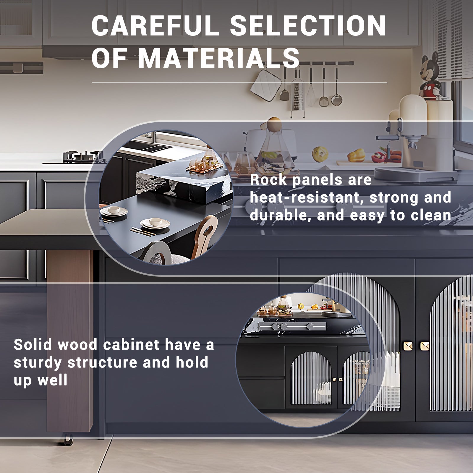 Exquisite Craftsmanship: The island countertop and its upper surface are made of durable rock slabs, which are both beautiful and practical. At the same time, the interior is carefully crafted with wood, which is known for its long-lasting durability