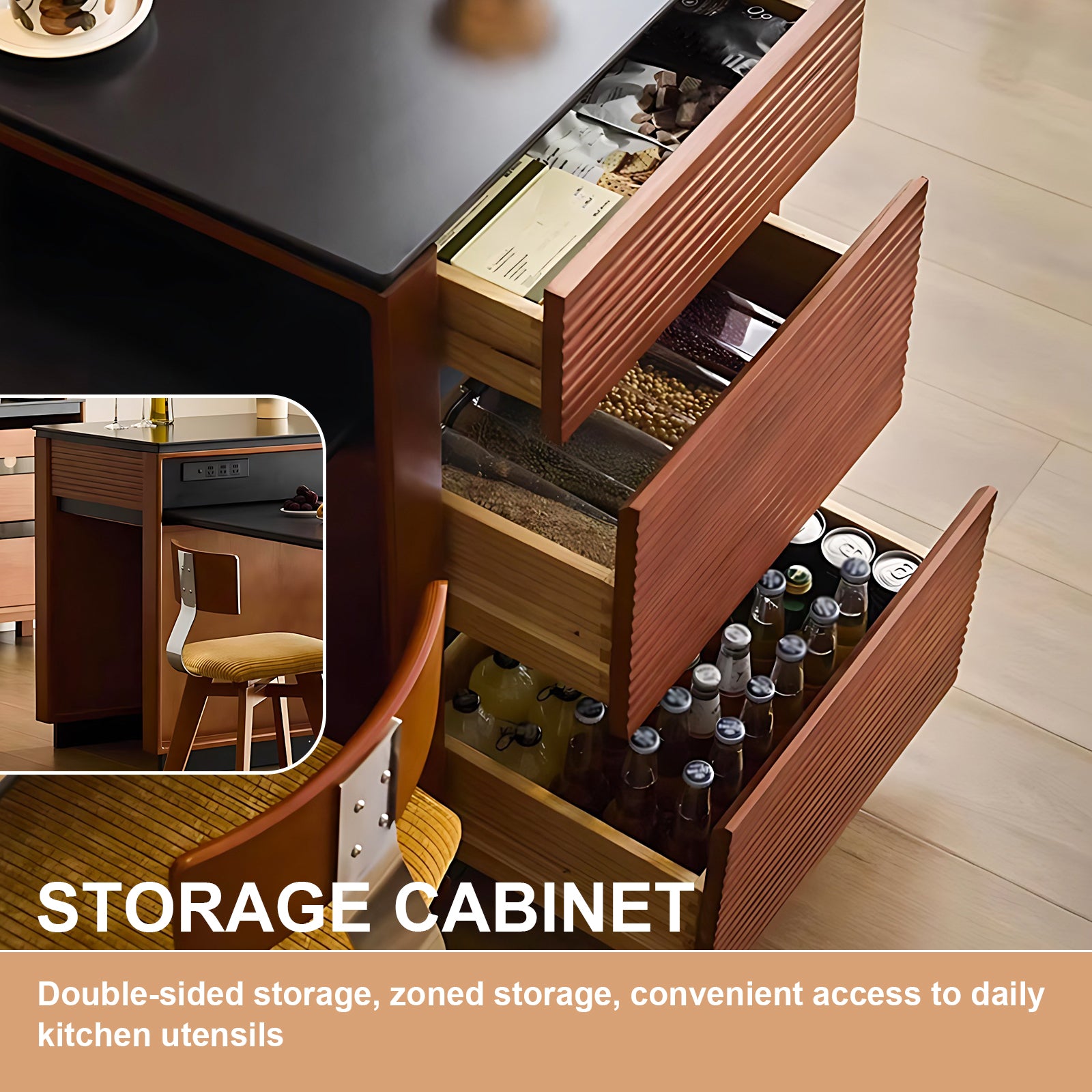 Large Storage Space: Both sides of the island can be used for storage. One side has three drawers to store items by category, and the other side is open storage for some appliances