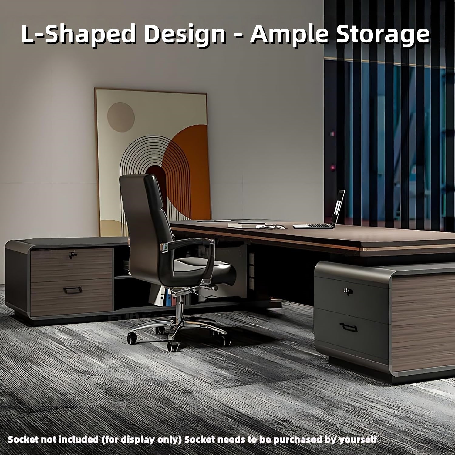 Smart Storage Solutions: Designed for maximum organization, this L-shaped executive desk combines secure file storage (2 lockable drawers), a dedicated CPU compartment, and multiple accessory organizers to keep all your work essentials neatly contained. The intelligent layout transforms cluttered cables and scattered supplies into a streamlined, professional workspace that enhances productivity.