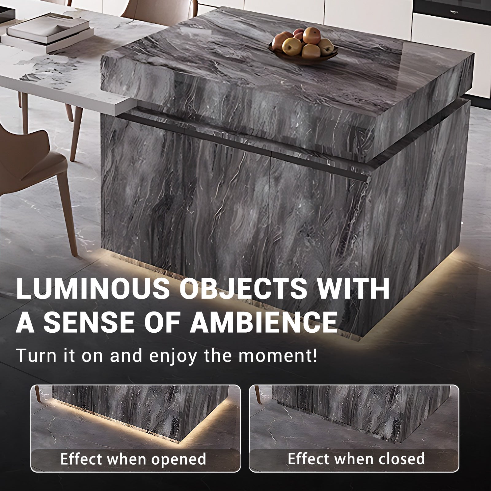 Sophisticated Texture Design: The island platform embraces an exclusive gray texture, adorned at its base with a circular array of ambient lighting. Complementing this, an L-shaped dining table design introduces an unparalleled allure to the setting