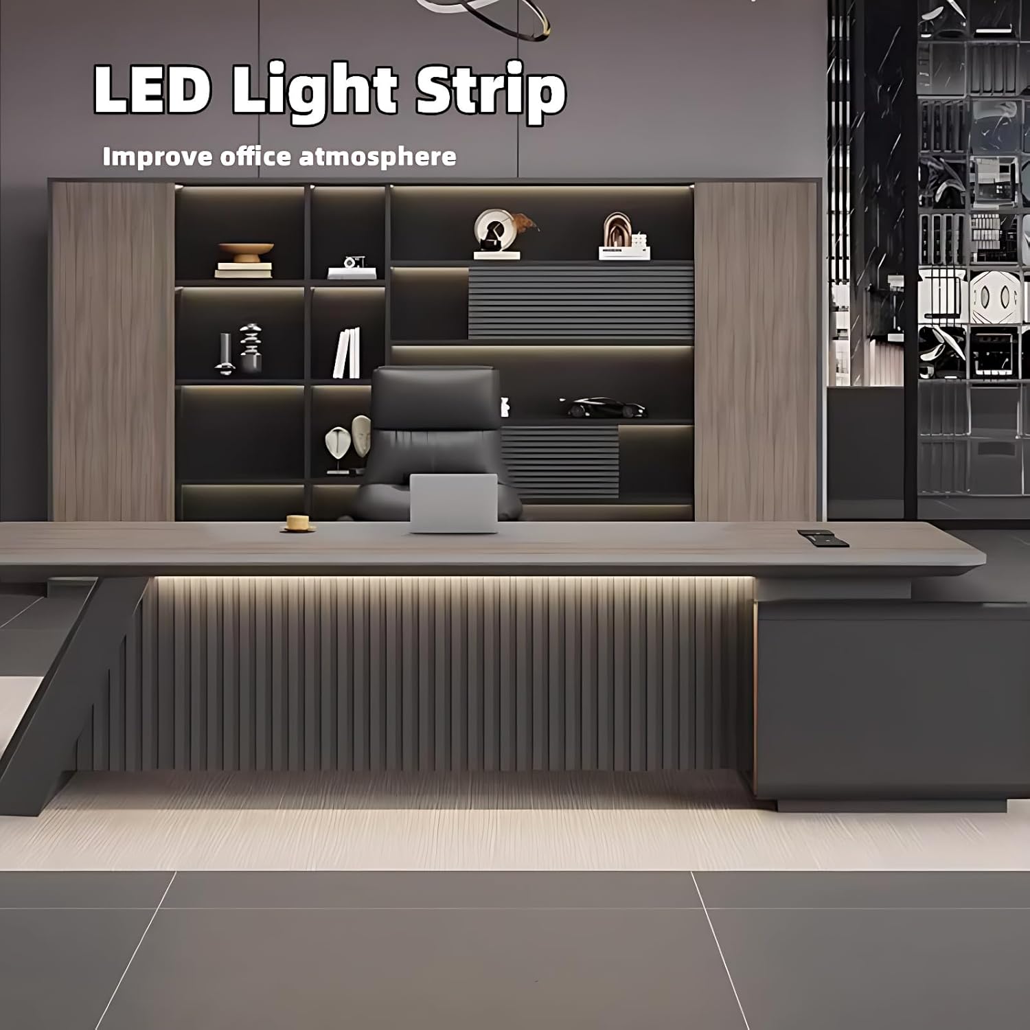 Contemporary Executive Elegance: This premium desk features a sleek, expansive work surface that elevates any office aesthetic. Integrated LED accent lighting enhances its sophisticated profile, creating a refined workspace ambiance.