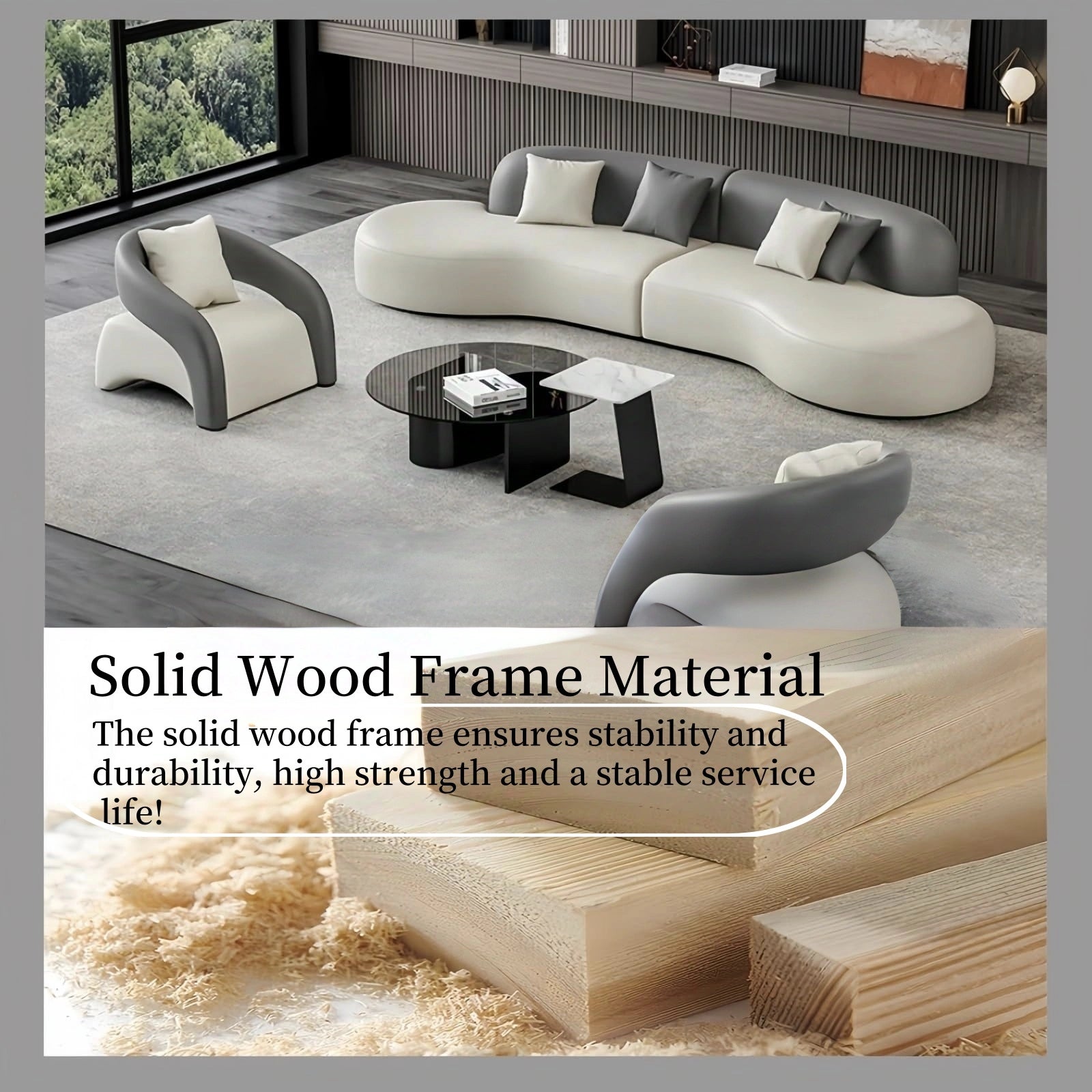 Complete home set: Luxurious modular sofa set to elevate your space A carefully crafted sofa set that includes a stylish curved modular sofa, two striking armchairs and two modern coffee tables will bring a new look to your living room, cozy corner or stylish office