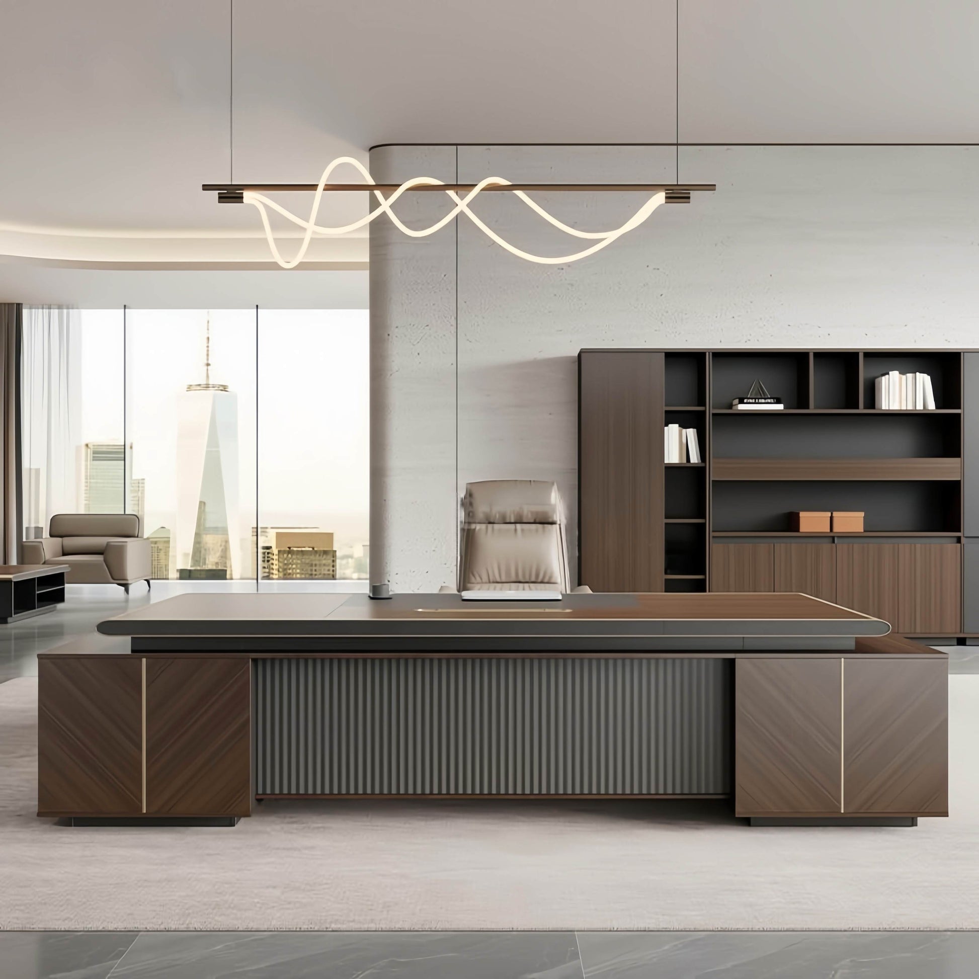 Modern and Elegant: This sophisticated workstation showcases rich espresso woodgrain surfaces contrasted with gray wave-patterned accents, creating dynamic visual texture within its space-efficient L-configuration. The harmonious blend of organic wood tones and contemporary linear detailing delivers both executive prestige and modern design appeal.