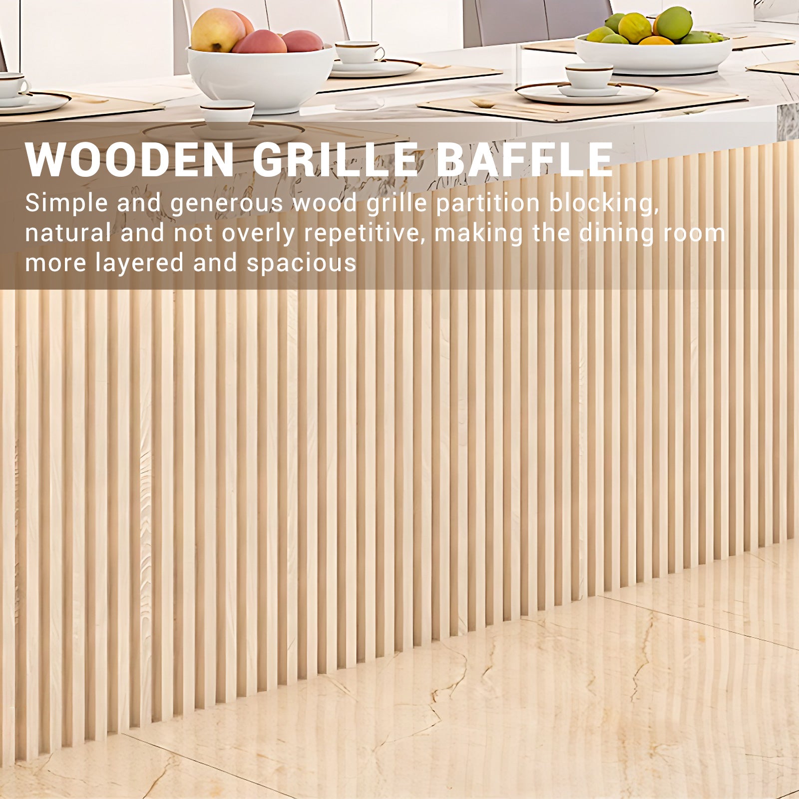 Unique Aesthetic Appeal: The brown striped panels complement the patterned island and dining table, creating a modern and charming visual effect. Mood lighting adds an extra layer of ambiance, turning your space into a warm and inviting haven
