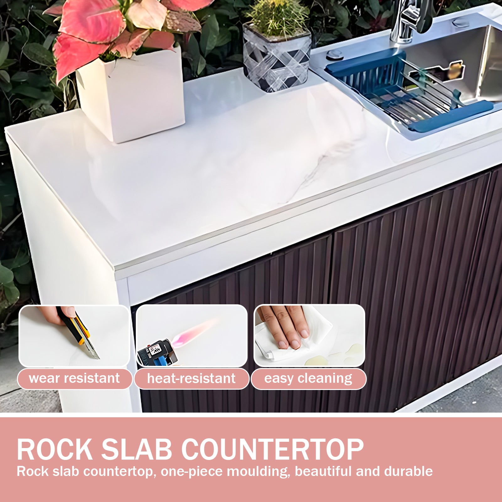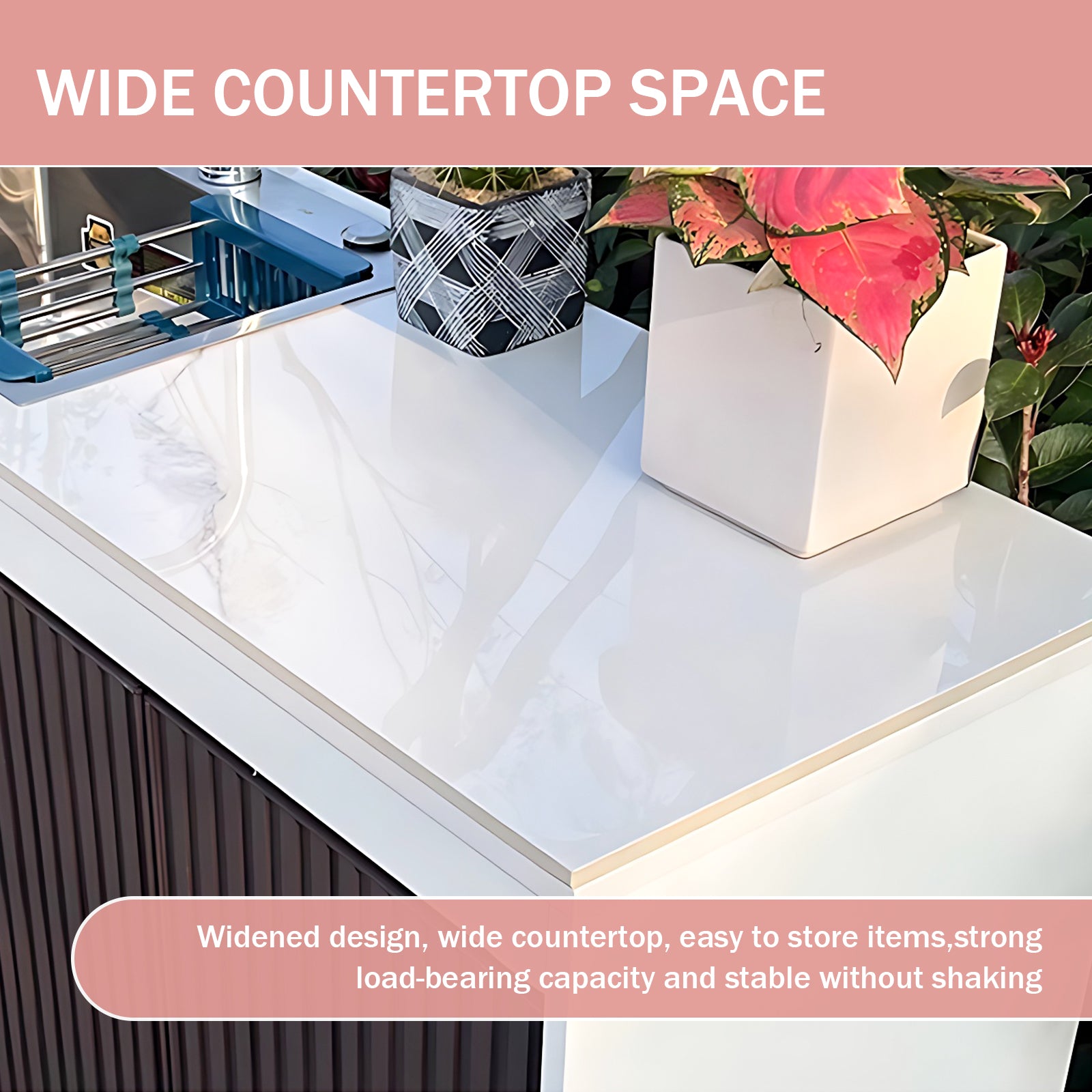 Modern Minimalist Style: white countertop with brown striped cabinets, can be integrated with a variety of outdoor scenes,the integrated countertop pool adds a sense of fashion and refinement,and enhances the style of the overall outdoor space
