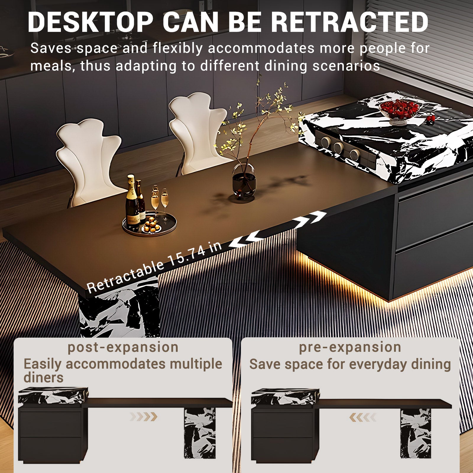 Scalable Design: The dining table has a flexible extension of 40cm, allowing seamless length adjustment according to your needs. Equipped with built-in sliding rails for easy sliding and flexible use, easily accommodating gatherings of all sizes