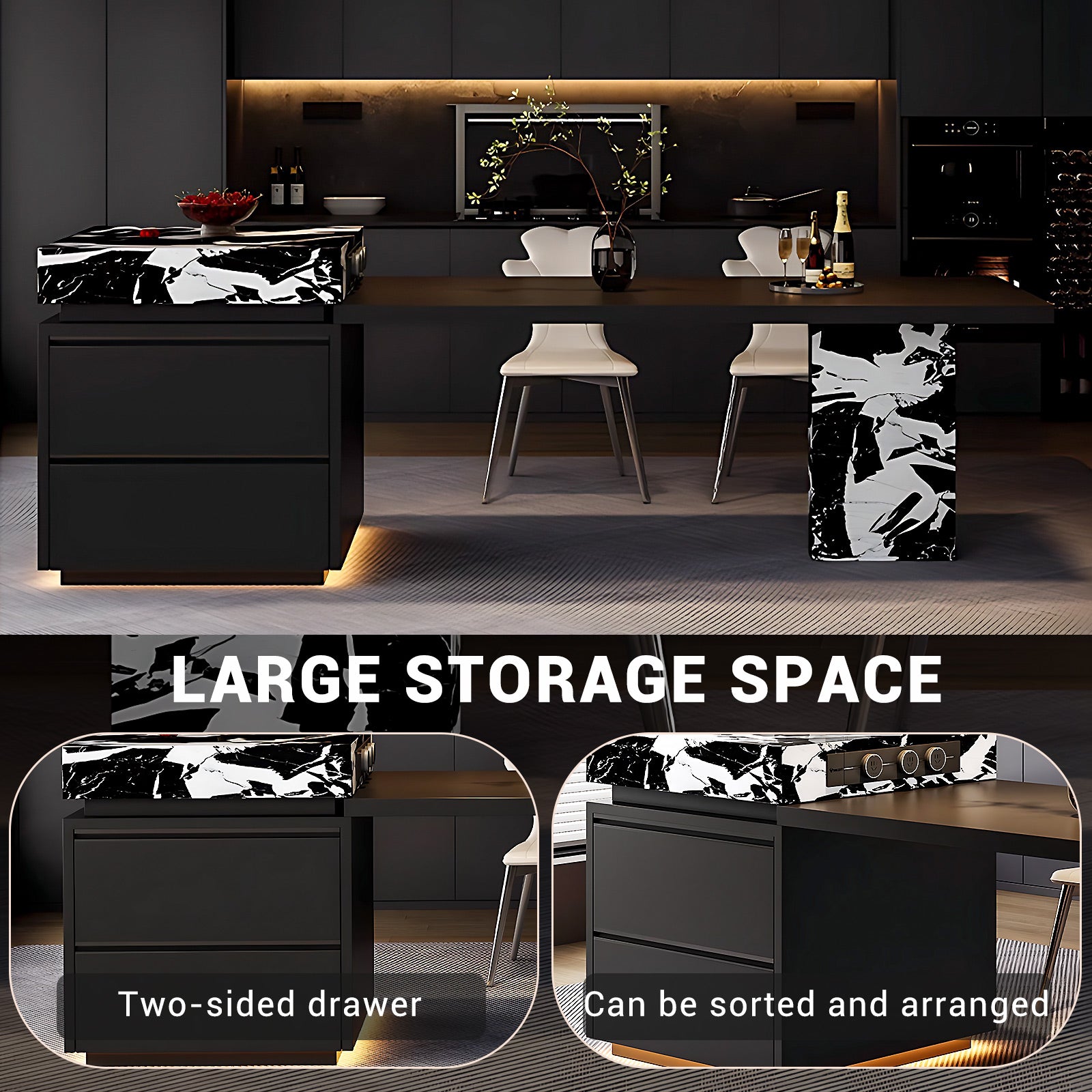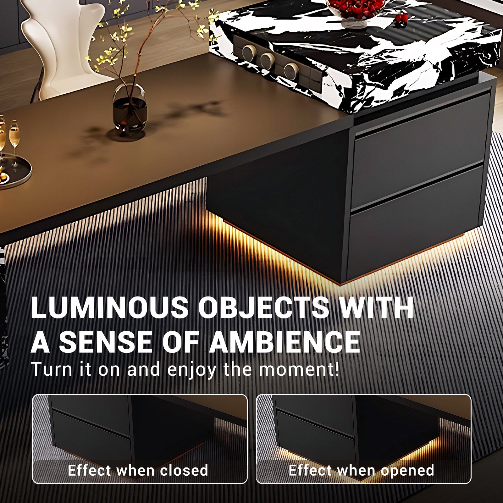 Multifunctional: The island platform has convenient sockets on the side for placing and using electrical appliances. It also has storage space such as drawers. The base is also decorated with a circle of ambient lights, adding a fashionable atmosphere