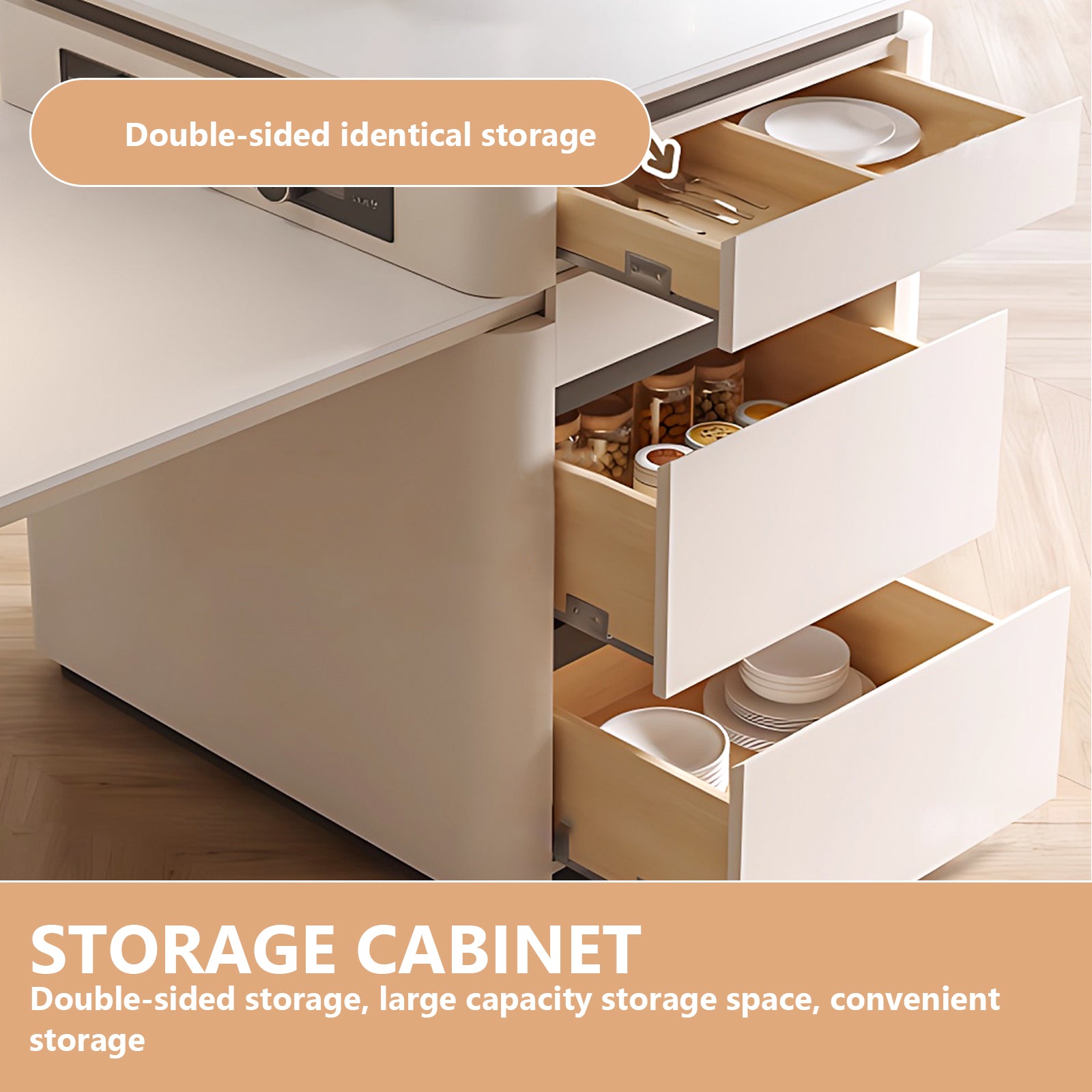 Retractable Dining Table: this model is an integrated design of dining table island and table;the table can flexibly adjust the size of the table according to the number of people eating, so it can be easily handled for both daily meals and parties