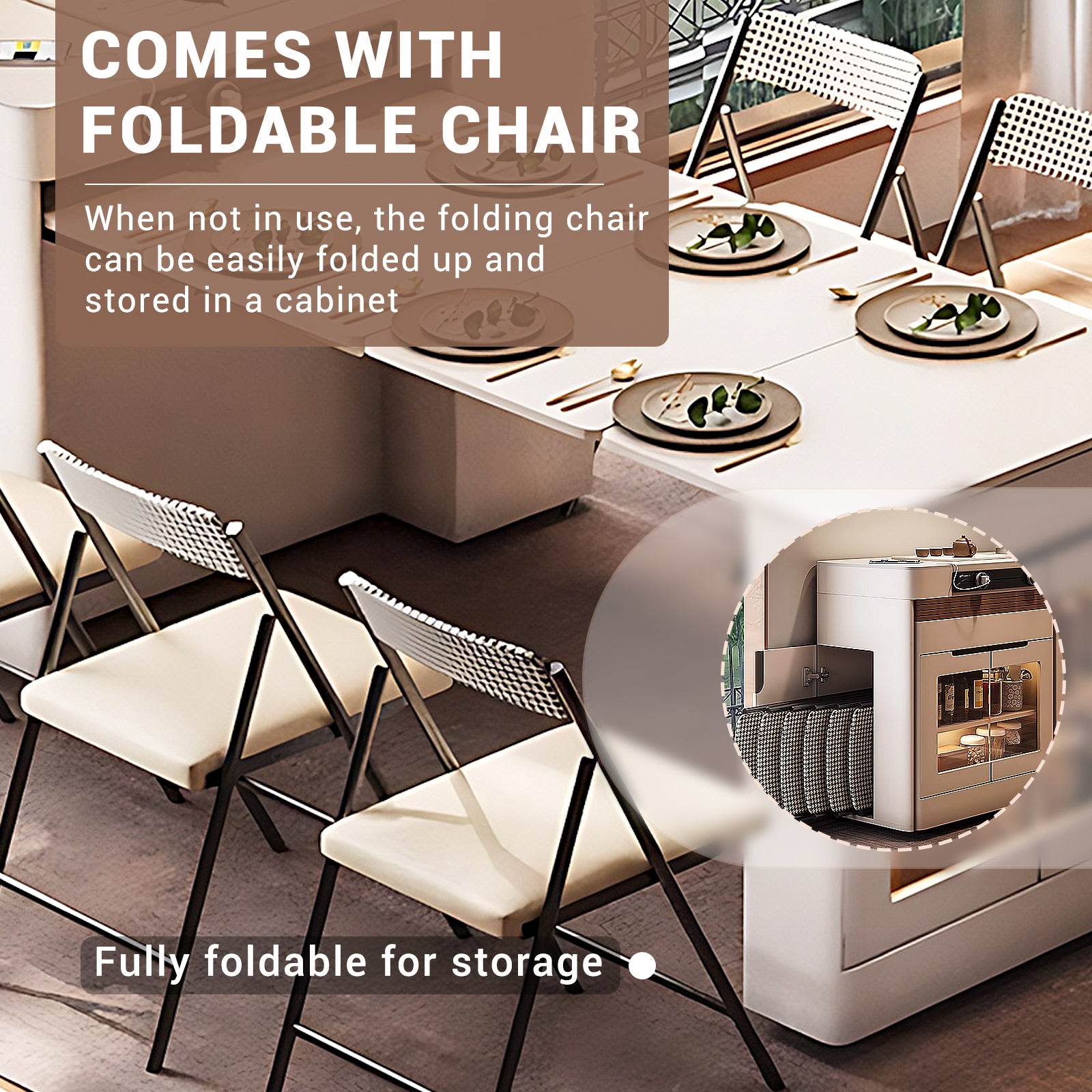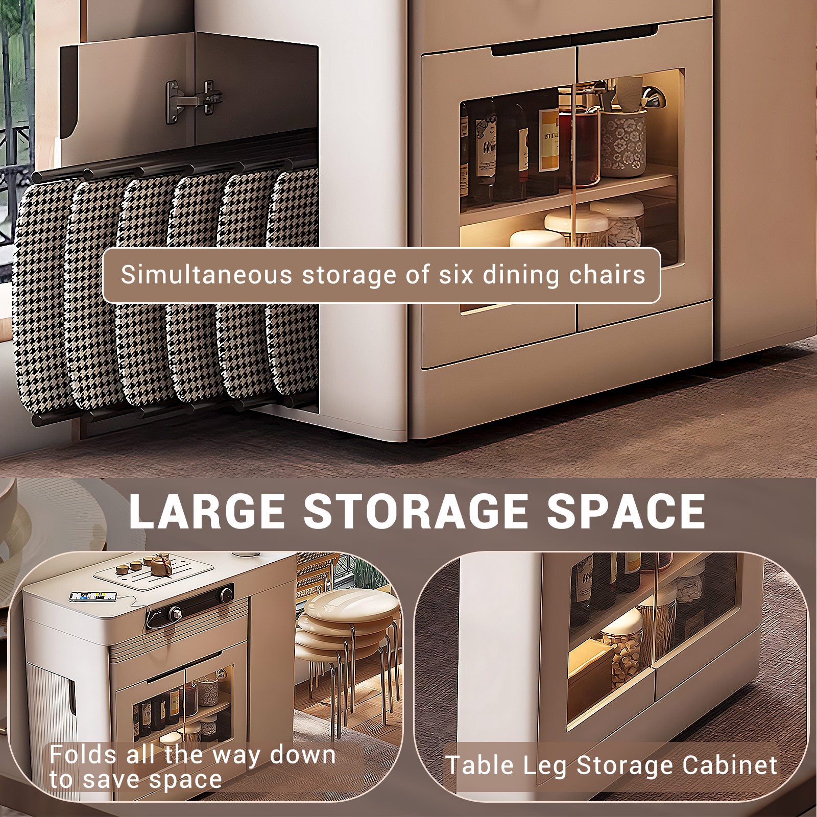 Ample Storage Space: The table legs are equipped with large-capacity cabinets, which are perfect for storing daily beverages, improving space utilization and providing practical convenience. The island is equipped with a dining chair storage cabinet, which can store chairs when not in use to save space. In addition, the tabletop provides ample surface for placing items, ensuring simplicity and convenience in any environment