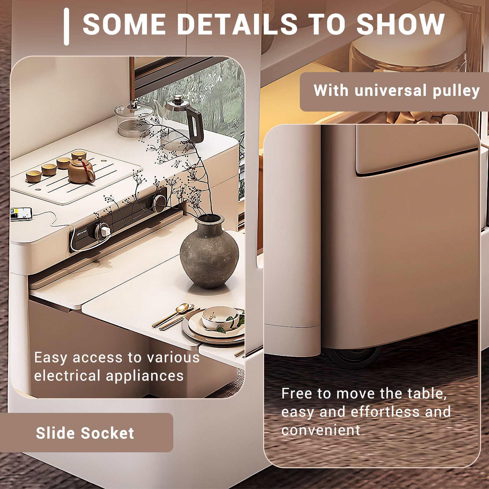 Versatile Dining Elegance: Our table boasts removable universal pulleys for seamless mobility, effortlessly adapting to any setting. Its fully automatic tea stove, with a simple handle turn, instantly converts it into a tea station. The integrated tea tray ensures quick drainage, enhancing your tea-brewing moments. Plus, a built-in socket keeps your devices charged and ready. Elevate your dining and entertaining with this innovative, multi-functional table design