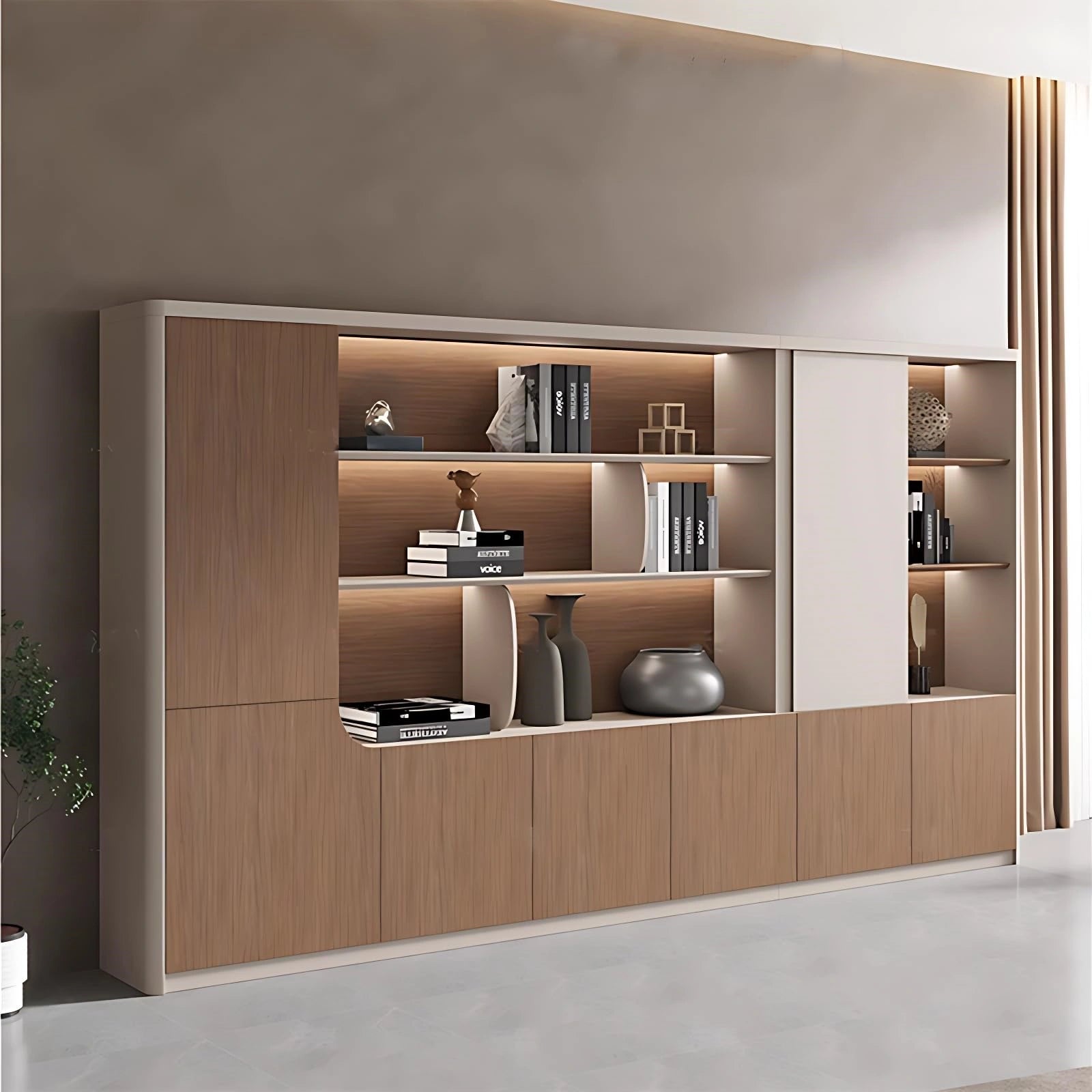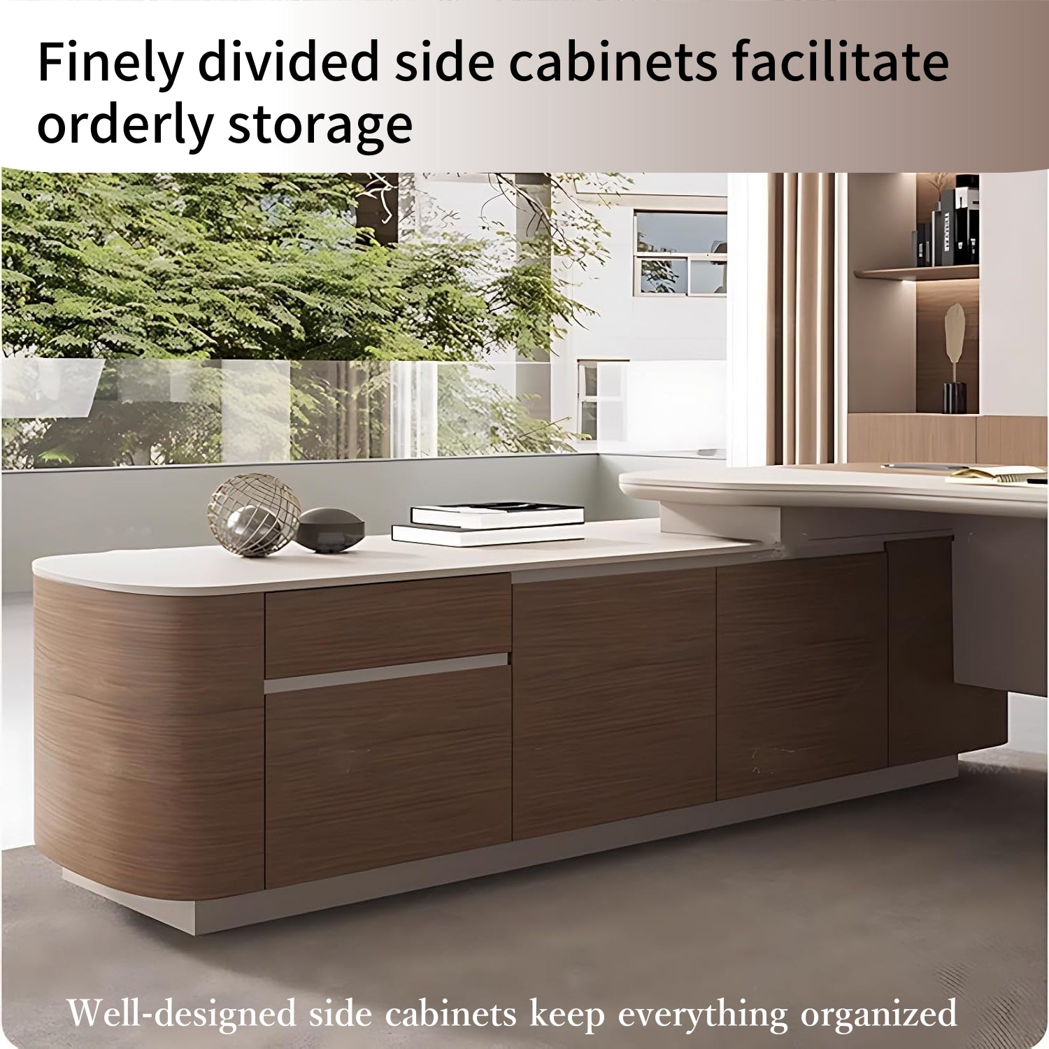 Modern Executive Elegance - This sophisticated administrative desk showcases a warm woodgrain and creamy beige color palette, accentuated by refined vertical grille detailing that adds dimensional texture. The gracefully rounded corners soften its silhouette, creating an inviting yet professional workspace perfect for contemporary offices.